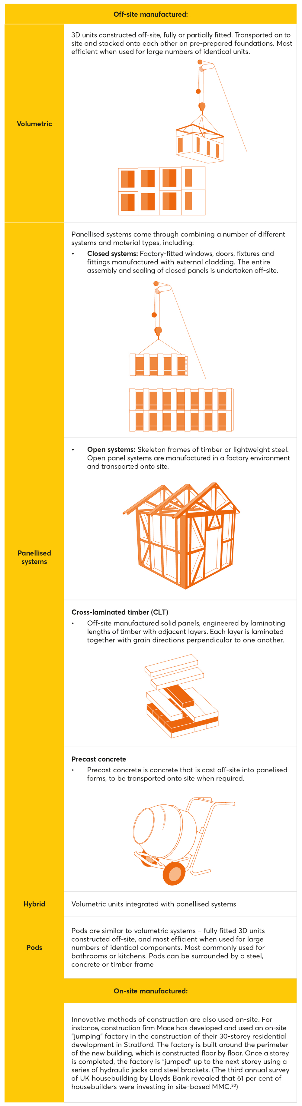 5 Our interviewees estimated that an MMC project can be completed in two-thirds of the time when accounting for manufacturing, site preparation and assembly. Other sources estimate that construction time for volumetric MMC schemes is 50-60 per cent that of traditional methods, compared to 30-40 cent for hybrid construction, and 20-30 per cent for panelised construction.