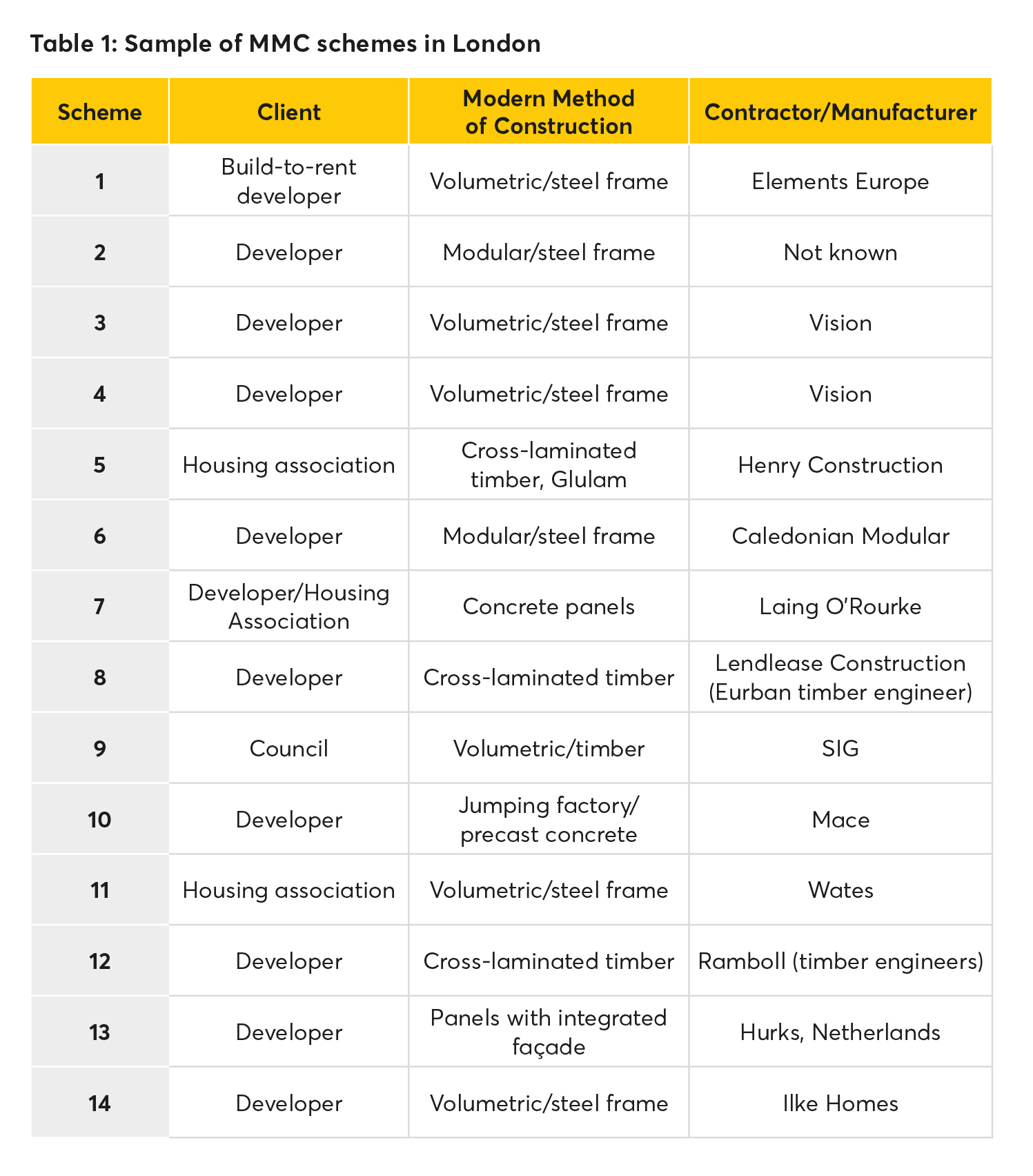 As part of our research, we analysed a sample of 14 MMC schemes in London by client, method of construction and contractor. Some schemes have been completed, while others are still underway. As presented in Table 1, the MMC schemes within our sample encompassed a range of different clients, including build-to-rent developers, large and small private for-sale developers, housing associations, and councils. As noted in the previous chapter, some forms of housing have a closer affinity with modular construction techniques owing to their ability to benefit from the speed advantages of MMC, including student housing (where units must be completed before the start of the academic year) and build-to-rent (where a quicker completion of units means more rent for investors). Both types have constituted big growth areas for London in recent years. In addition, local housing companies such as Brick by Brick and BeFirst – which are growing in size as housing providers in the capital 3 – intend to build modular homes as part of their portfolio.
