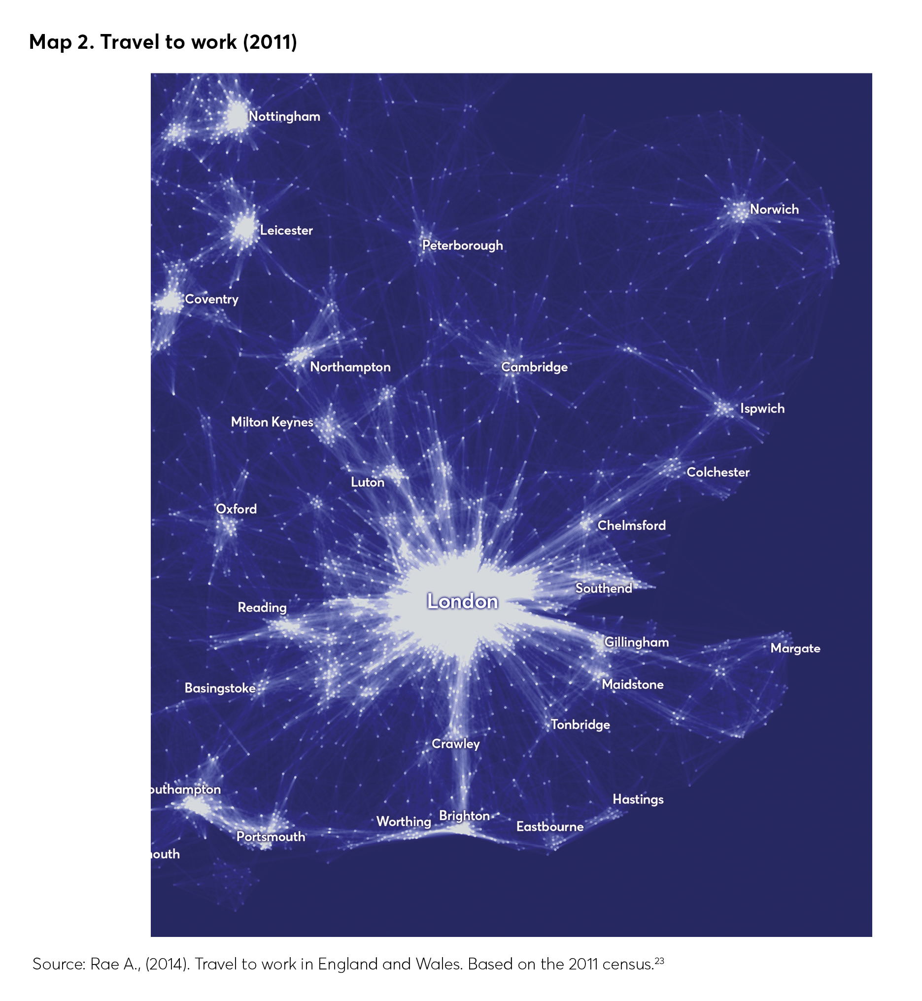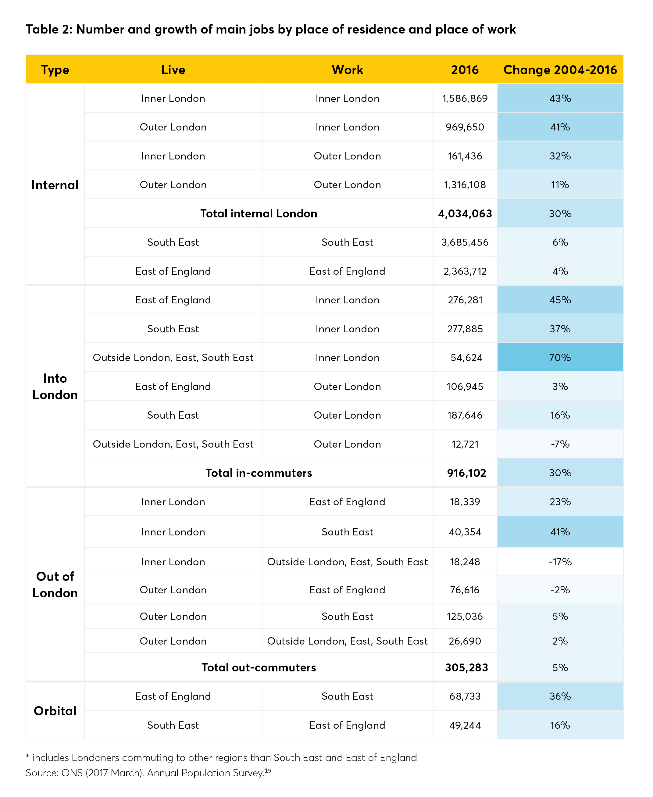Commuting is the most visible evidence that London has grown more connected to the rest of the Wider South East. This increased connectivity is partly thanks to rapid job growth in central London. In 2016, there were 900,000 people commuting into Greater London (a 30 per cent increase on 2004) and 300,000 making the reverse journey (a five per cent increase; see Table 2 on page 6).