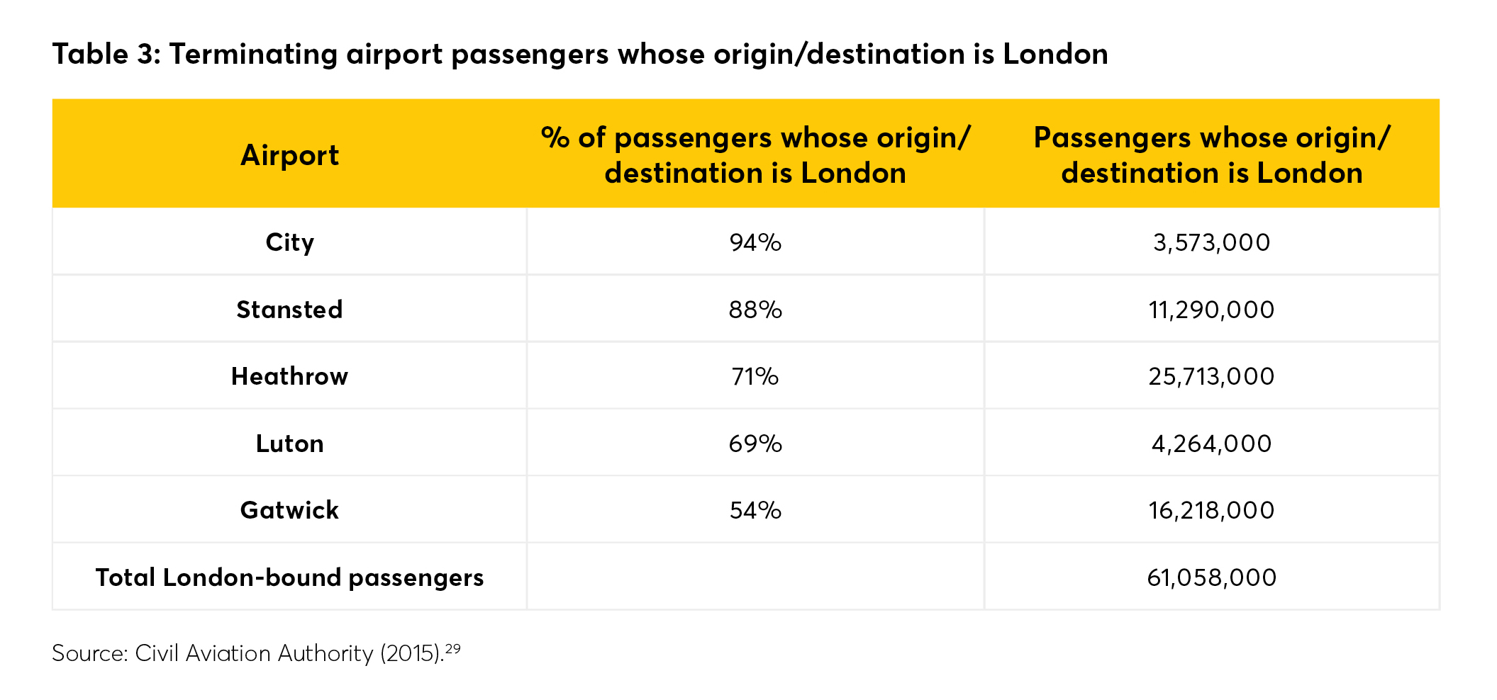 Some transport assets are fully regional. Most London airports are not located in London, but they serve passengers living either side of the M25: half (52 per cent) of airport passengers travelling to or from London use an airport outside London (see Table 3).