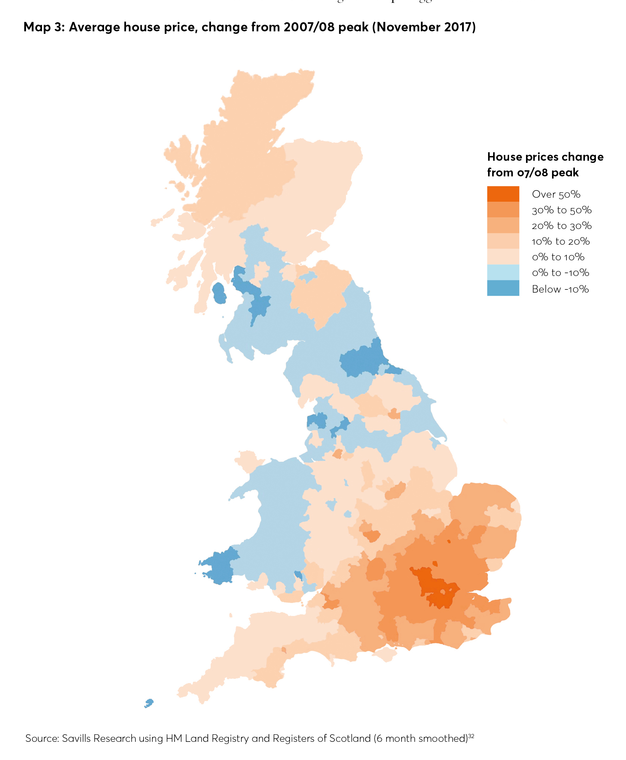 The tight integration of London with the rest of the Wider South East means that housing markets around London have felt the heat of the capital’s growth (see Map 3): as land supply in the capital has tightened, demand for housing has “leap-frogged” the Green Belt.