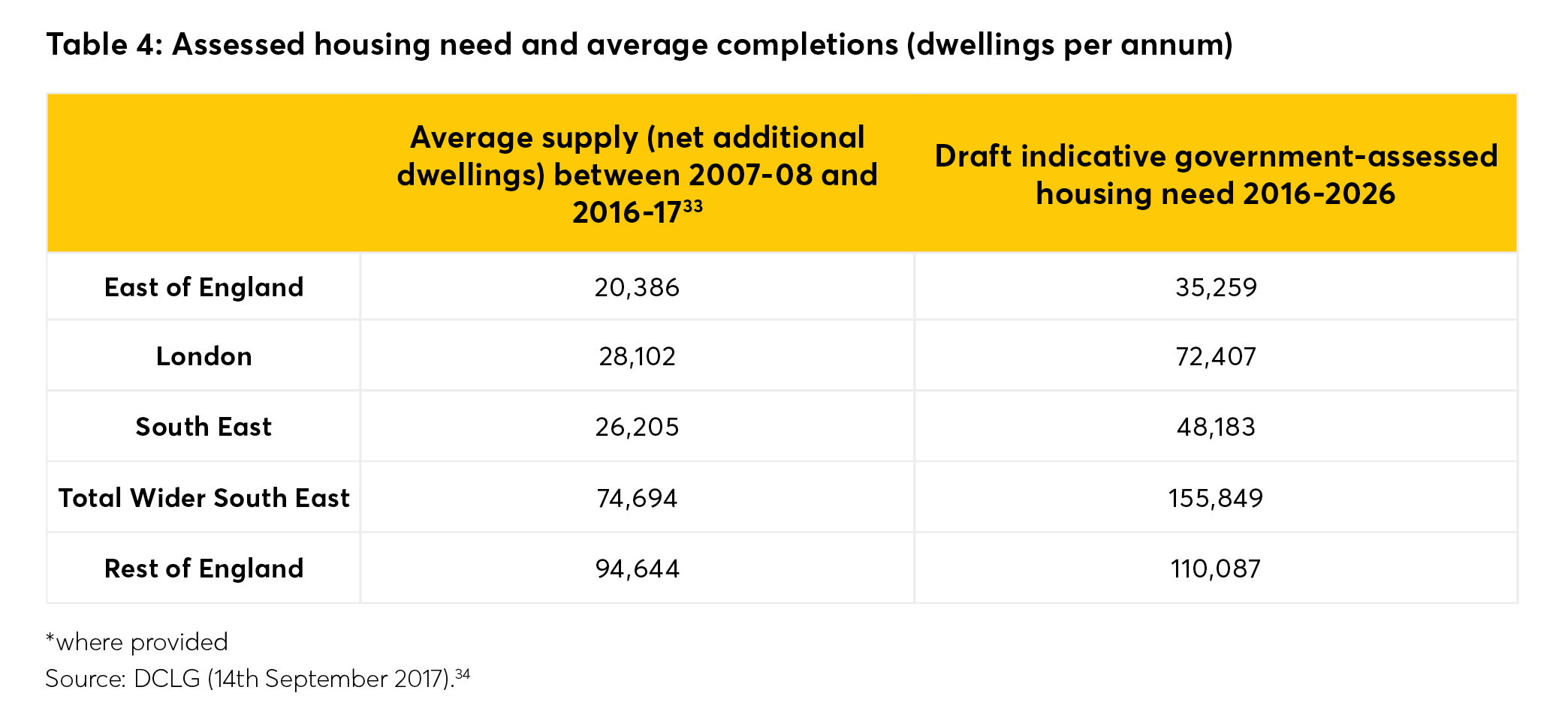 Problems with accessing housing are exacerbated by poor housebuilding rates: household growth has outpaced housing completions for several decades. Increasing housing supply has been a challenge throughout the Wider South East – especially in “affordable” housing. Because of this backlog, the challenge ahead is steeper: the assessment of housing need drafted by government, based on future population growth and current housing affordability, suggests that Wider South East local authorities will need to deliver over 150,000 homes every year of the next decade – 59 per cent of England’s assessed housing need (see Table 4). The Mayor of London’s draft London Plan sets a target of 65,000.