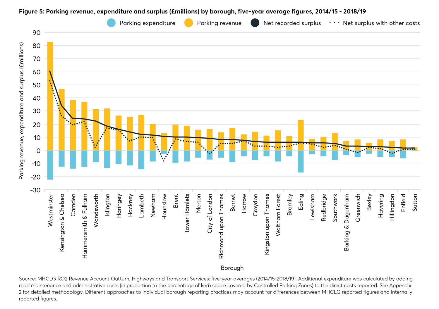 According to MCHLG revenue expenditure data, these additional costs come to an extra £133 million per annum (averaged for the last five years) and, when taken into account, reduce the boroughs’ parking surplus to £243 million. If we replace each borough’s reported parking expenditure with our calculations, inclusive of additional parking-related costs (see Appendix 2 for the detailed borough breakdown) and compare them to parking revenues, we see that surplus diminishes significantly or becomes a loss for some boroughs (see Figure 5).