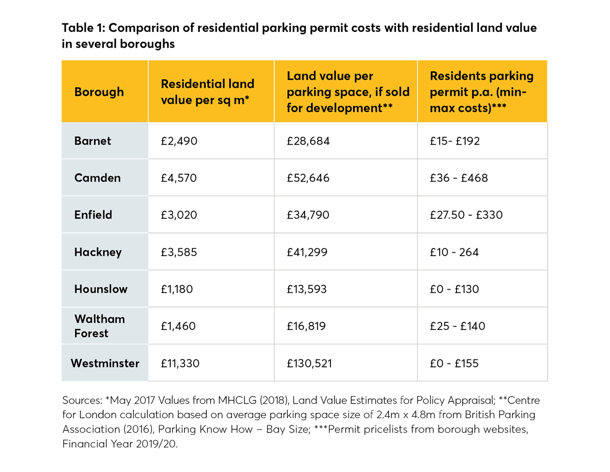 Using residential land values, property consultancy JLL estimates that the 3,200 hectares taken up by vehicles in London is worth £172 billion. 3 Using illustrative land values, Table 1 compares the capital value per parking space across selected London boroughs to what residents pay for a year’s parking. Treating the parking permit as an annual rental payment, the yield on the capital value is very low – less than one per cent in most cases. However, while this comparison is useful for car parks – which could potentially be converted into homes – few on-street parking spaces would be realistically developable.