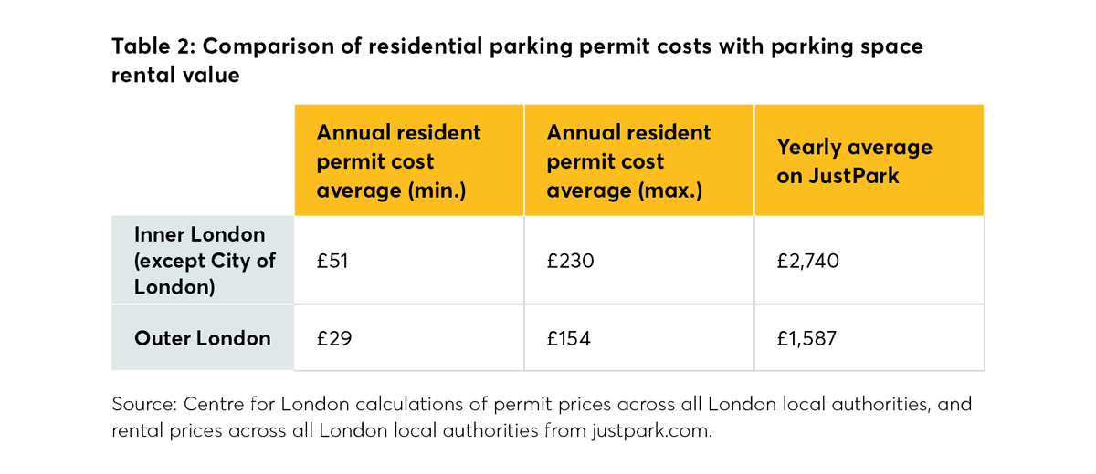 A further approach is to compare resident permit costs with the market value of parking. The rise of peer-to-peer rental of parking spaces through online platforms like JustPark has allowed an accurate comparison between the price the market can support for a parking space and what local authorities are currently charging (see Table 2). The fact that prices across London for equivalent parking spaces rented through JustPark are at least 10 times higher than prices charged by local authorities suggests that residential parking permits are being priced a great deal lower than they would be on the open market.