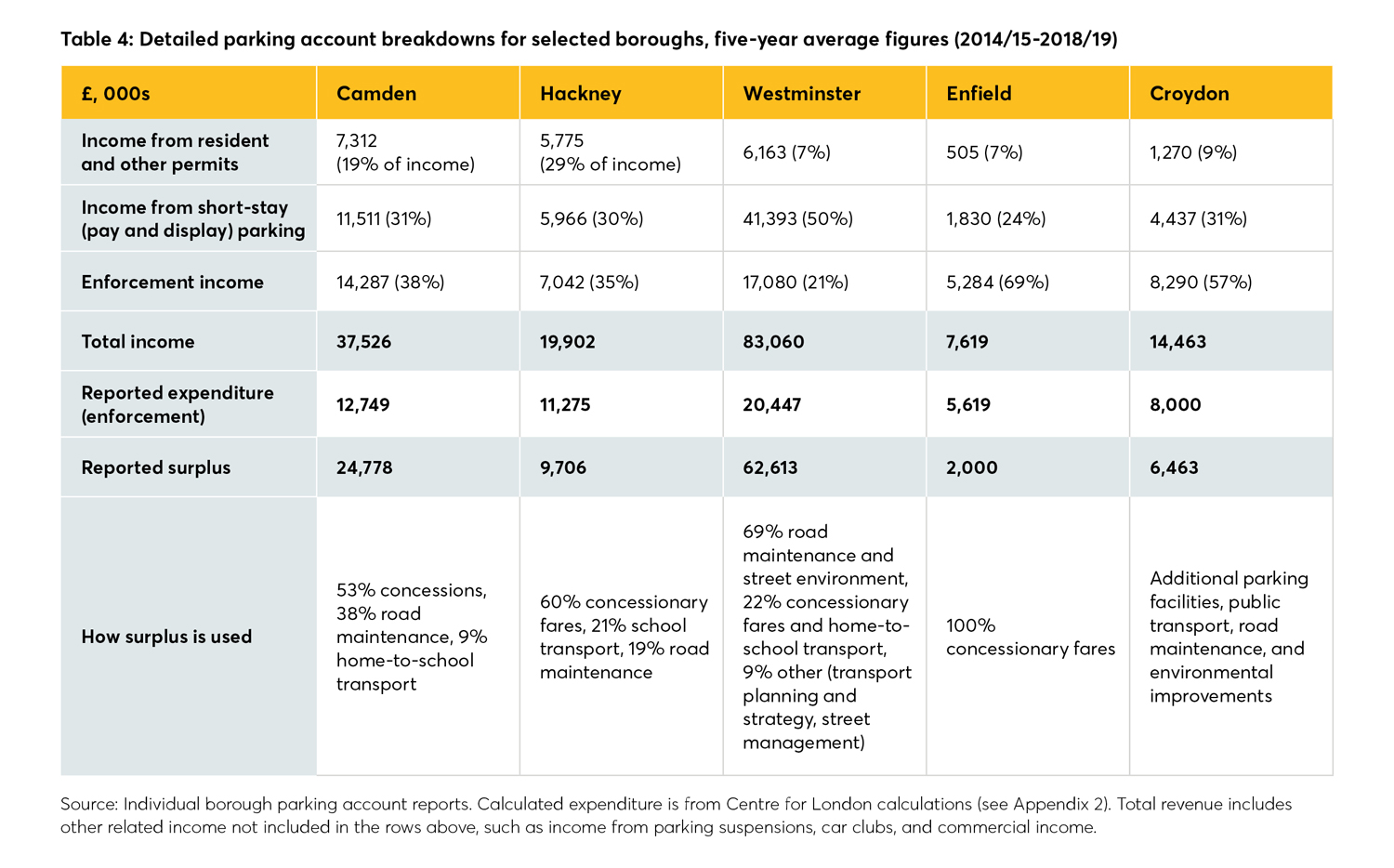 To obtain the relevant data to answer this question, we examined borough parking accounts, which report individual boroughs’ revenue from parking and associated expenditure (Figure 5). According to the Ministry of Housing, Communities and Local Government (MHCLG), London boroughs collectively made an average annual surplus of £376 million between 2014/15-2018/19. People often perceive this as “profit”, but the Traffic Management Act ringfences the use of parking surplus for transport services. In practice, boroughs use it to support road maintenance and provisions for disadvantaged groups, such as Freedom Passes for pensioners and specialist transport for disabled residents or children with special educational needs.