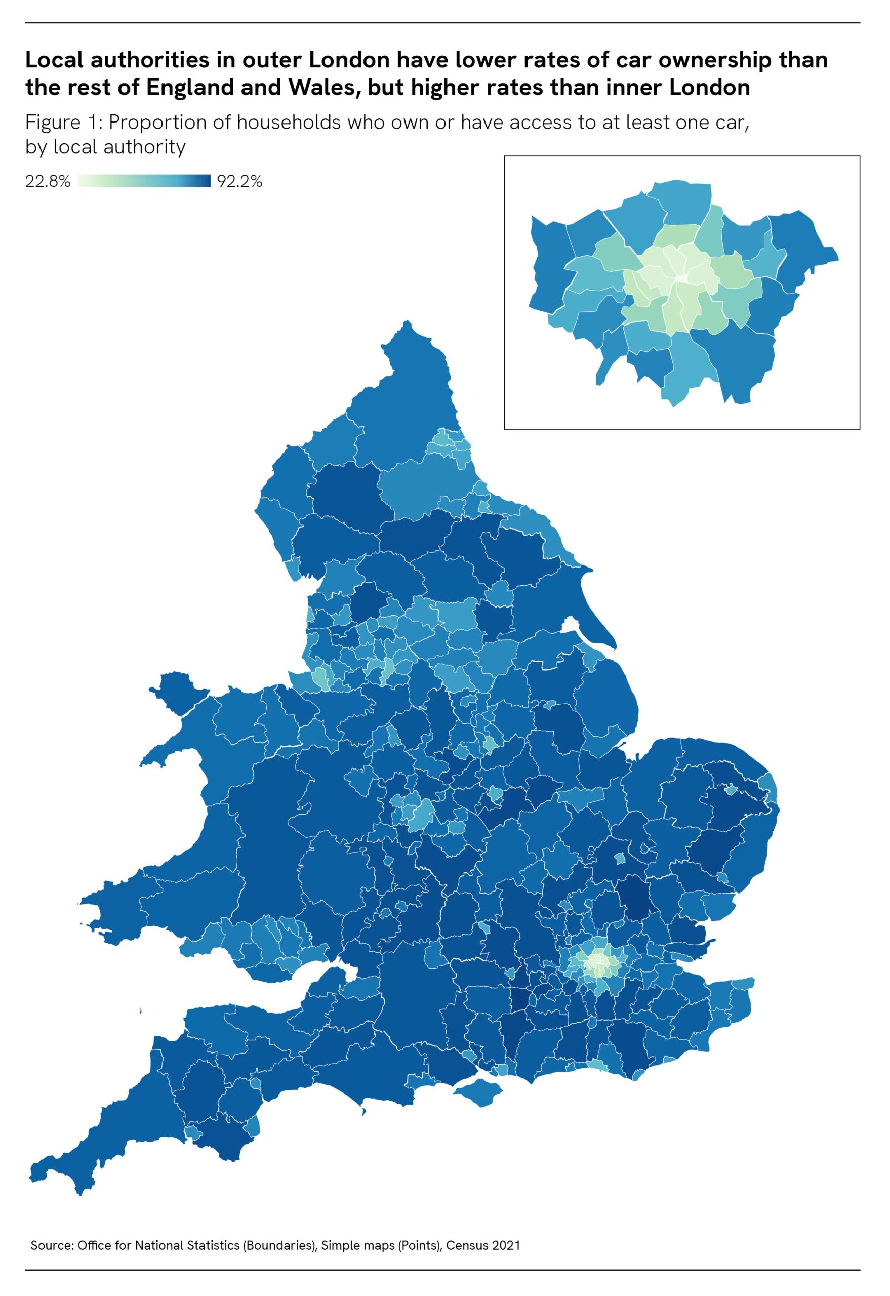 Indeed, a large proportion of people in inner London are already living “car free”: 2021 census data show that the proportion of households with no cars or vans in inner London is nearly double that of outer London (58 per cent compared to 31 per cent 2 – see Figure 1).