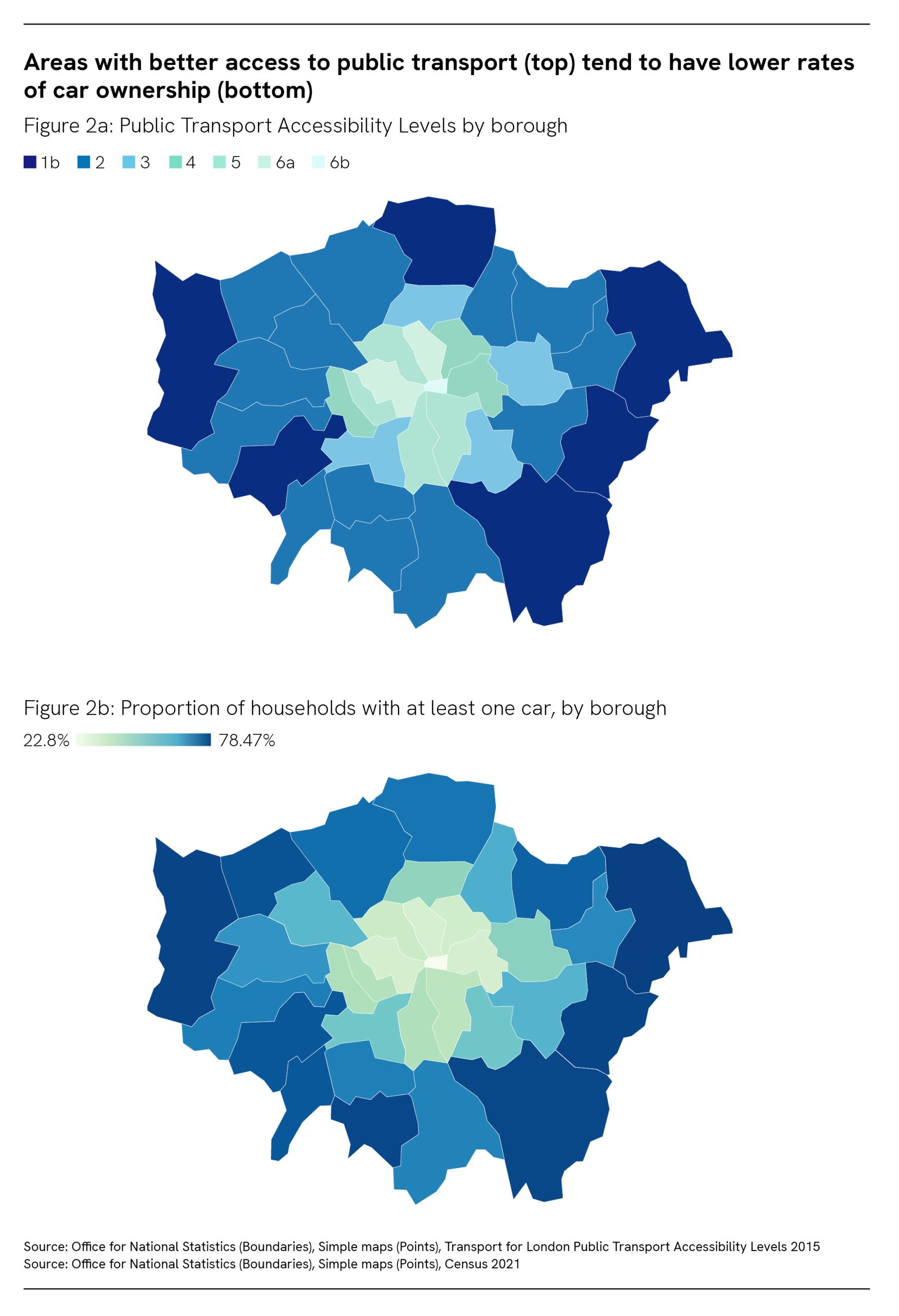 Poor access to the public transport network can contribute to greater use of private cars. In London there is a correlation between the boroughs in which a higher proportion of households own a car, and those scoring worst on TfL’s Public Transport Accessibility Level metric (which assesses connectivity to the transport network by combining walking time to stations or stops with the level of service provided – see Figure 2). 2 69 per cent of households in outer London have access to or own a car, compared with 42 per cent in inner London and 77 per cent across England as a whole. Compared to the rest of England, a greater proportion of households in outer London with access to a car have only one, rather than two or more cars.