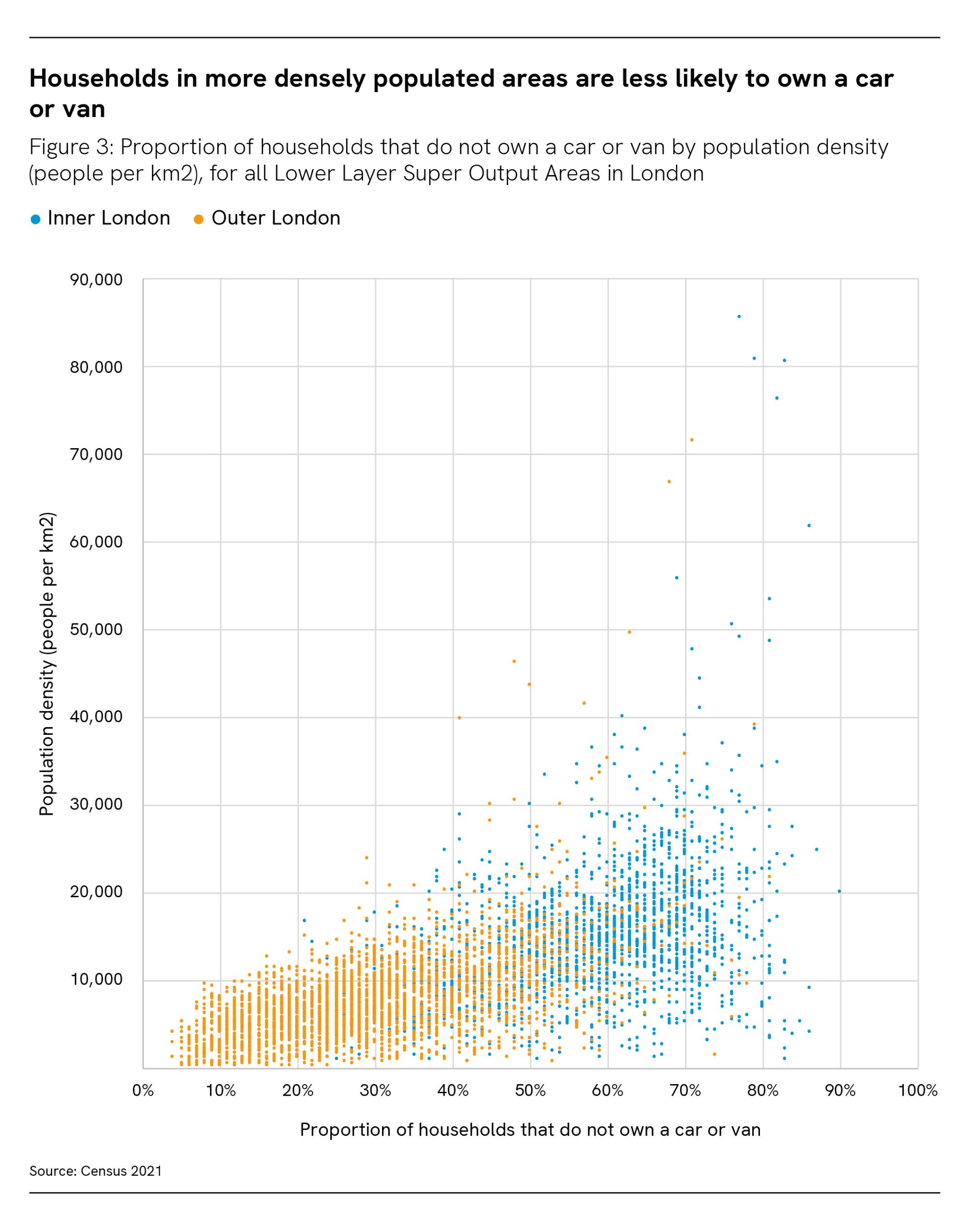 There exists a link between low-density development and higher levels of car dependence 3: in areas with higher population density, fewer households own a car or van (see Figure 3). Higher proportions of car ownership in areas with low population density can be due to residents needing to travel a greater distance to access everyday services and amenities. Residents may also need to travel further to access the public transport network.