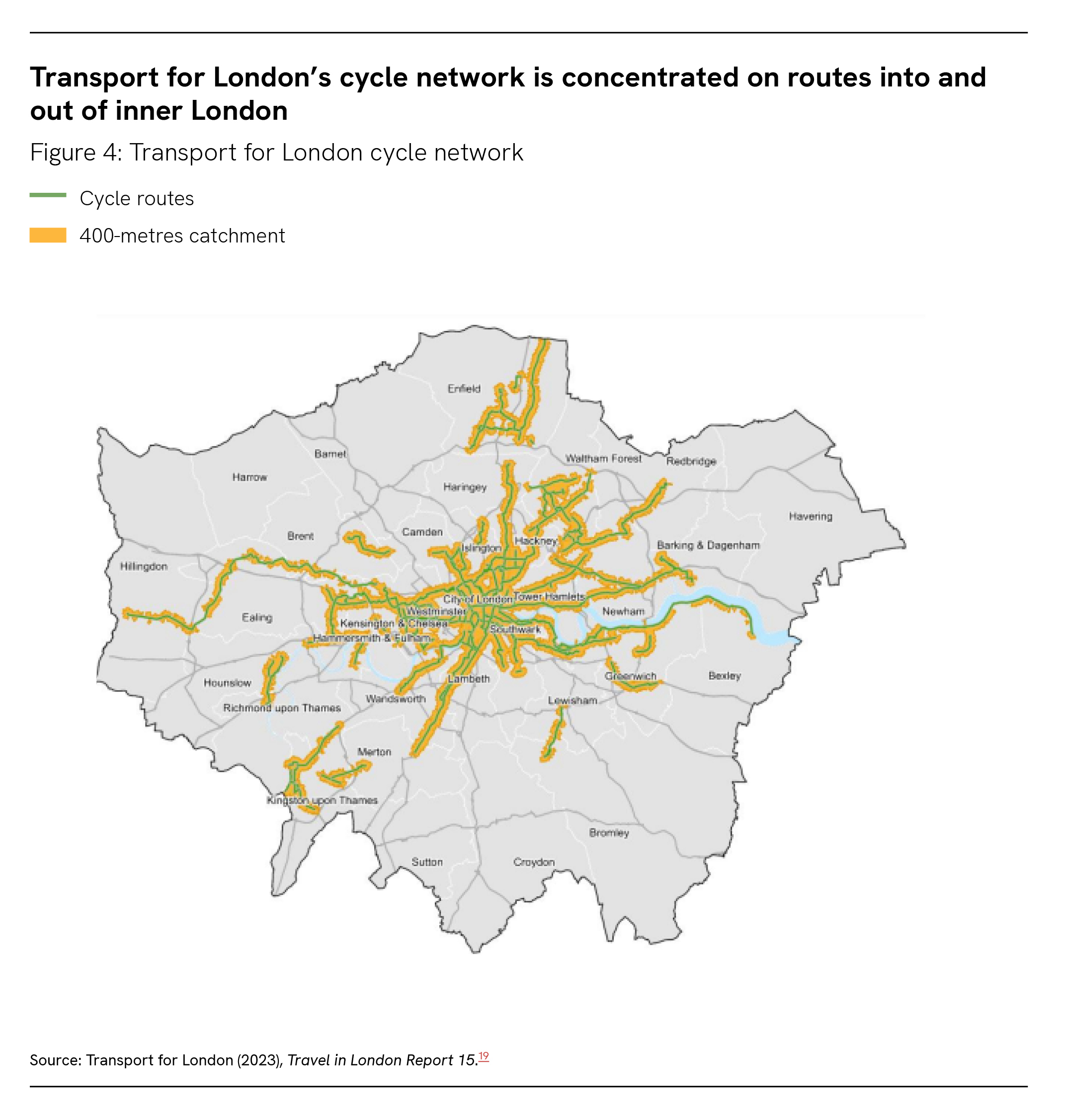 Today, approximately 22 per cent of Londoners live within 400 metres of a London Cycleway. The cycle network is focused on offering radial routes to and from central and inner London, meaning that while good coverage exists towards the centre of the city, many areas in outer London have very little or none (see Figure 4). Radial routes are useful for commuting, but less so in the case of local journeys for family and leisure purposes. Indeed, differences in cycling uptake persist among Londoners, with men, people aged under 35, and people in medium-to-high income groups more likely to cycle than others. 4