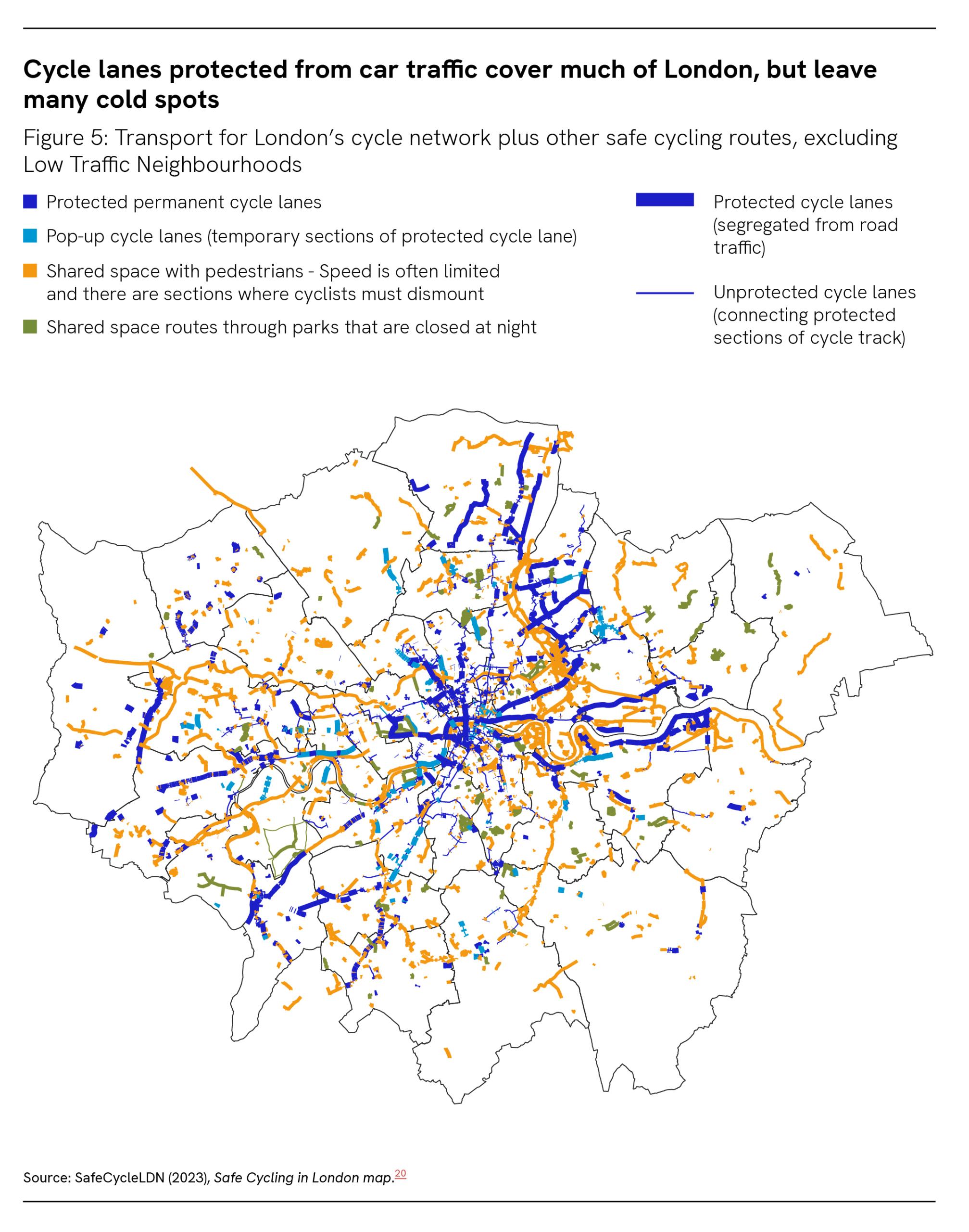 In regard to cycle safety, SafeCycleLDN has produced a more comprehensive map of places in London that are safe to cycle. While these areas cover much more of the capital, there remain many cold spots in outer London (see Figure 5).