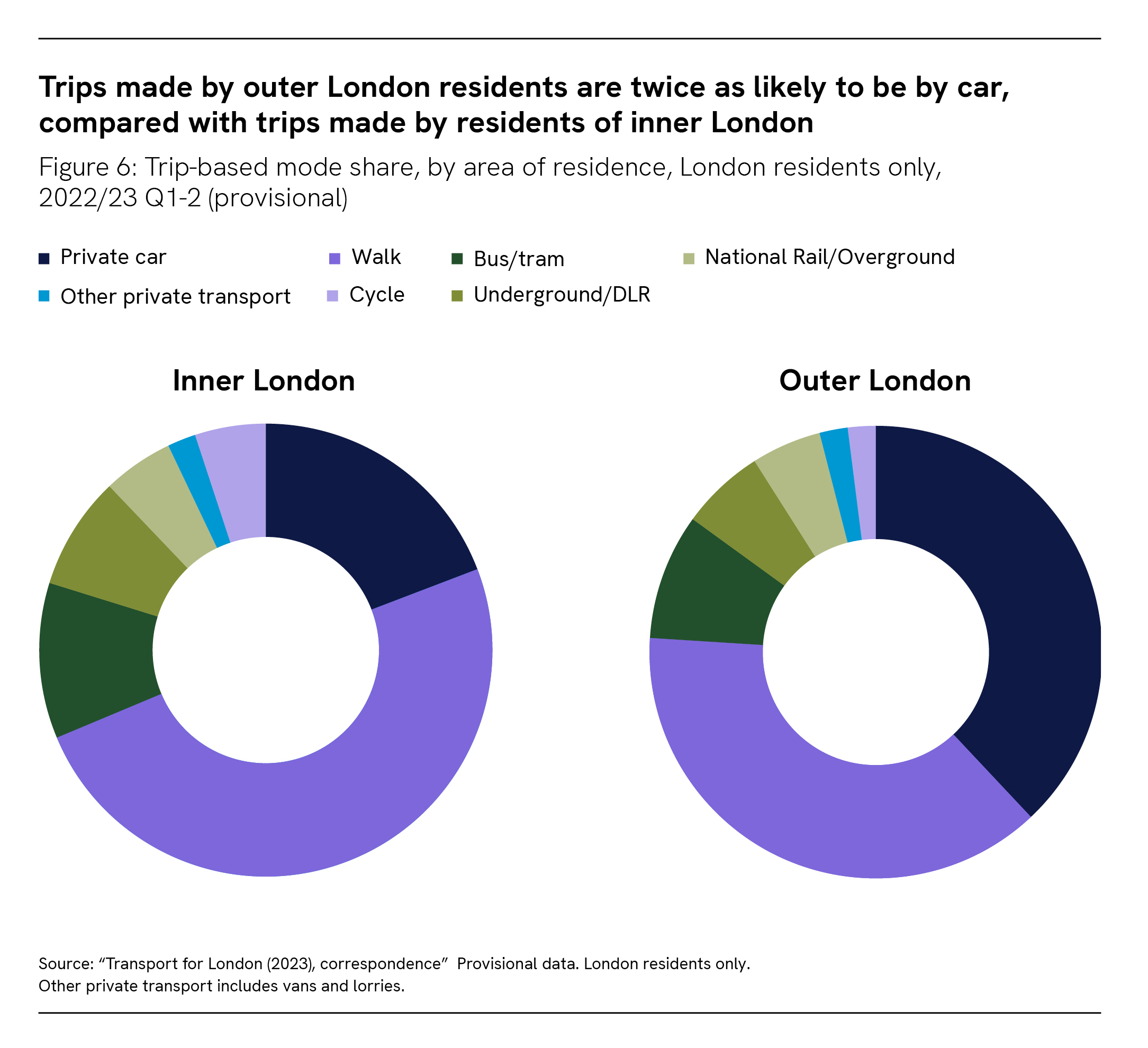 According to data from Transport for London, trips by active and sustainable modes of transport account for 60 per cent of trips made by outer London residents, compared to 78 per cent of trips by residents of inner London 29 (see Figure 6).