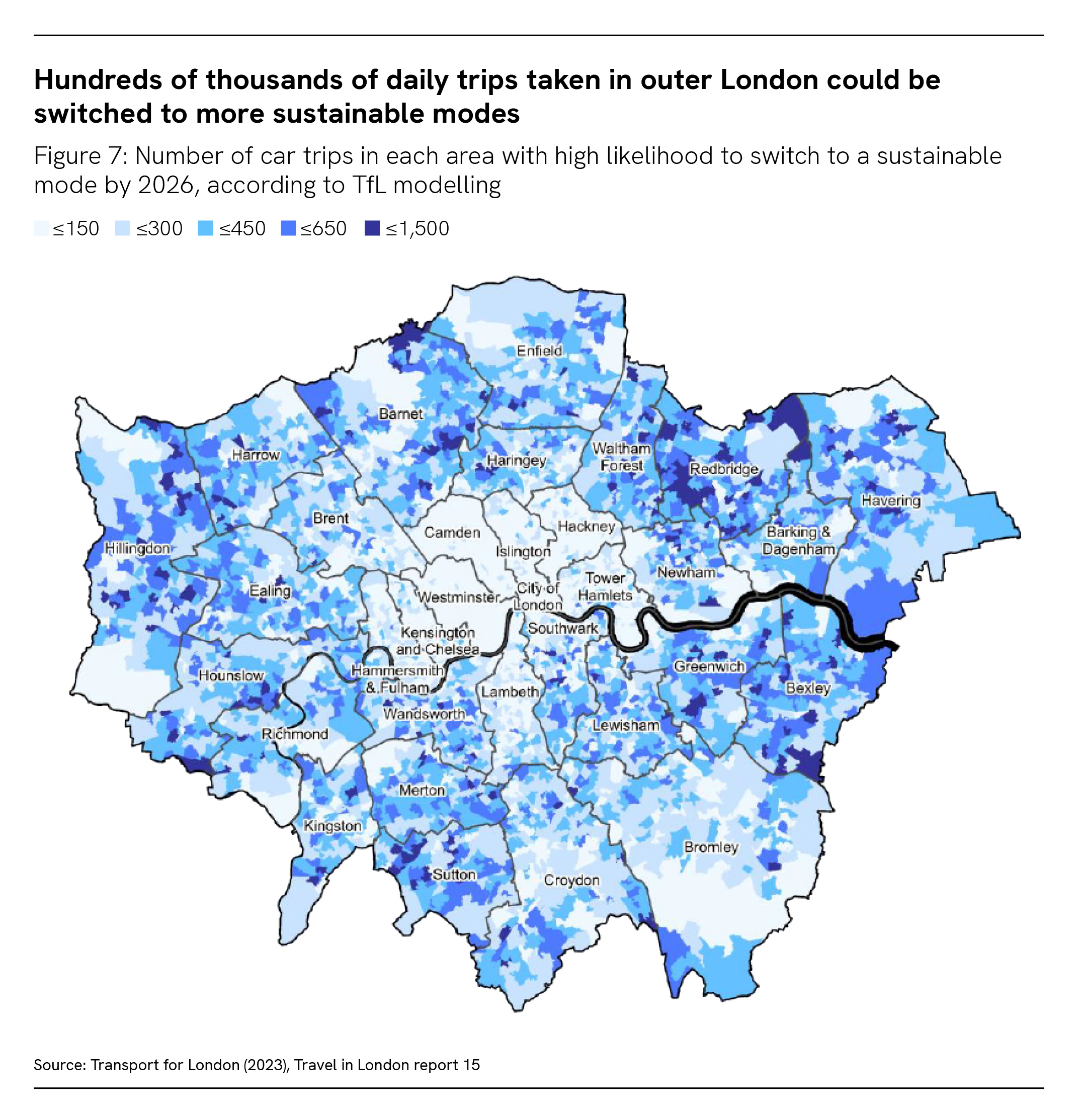 The report suggests that the highest number of car trips with a high likelihood of switching are those that have both their origin and destination within outer London – nearly half a million (494,000) daily trips. 2 Areas with higher numbers of car trips with a high likelihood of switching to sustainable modes include areas in outer east London such as Redbridge, Waltham Forest, Greenwich and Bexley (see Figure 7). 2
