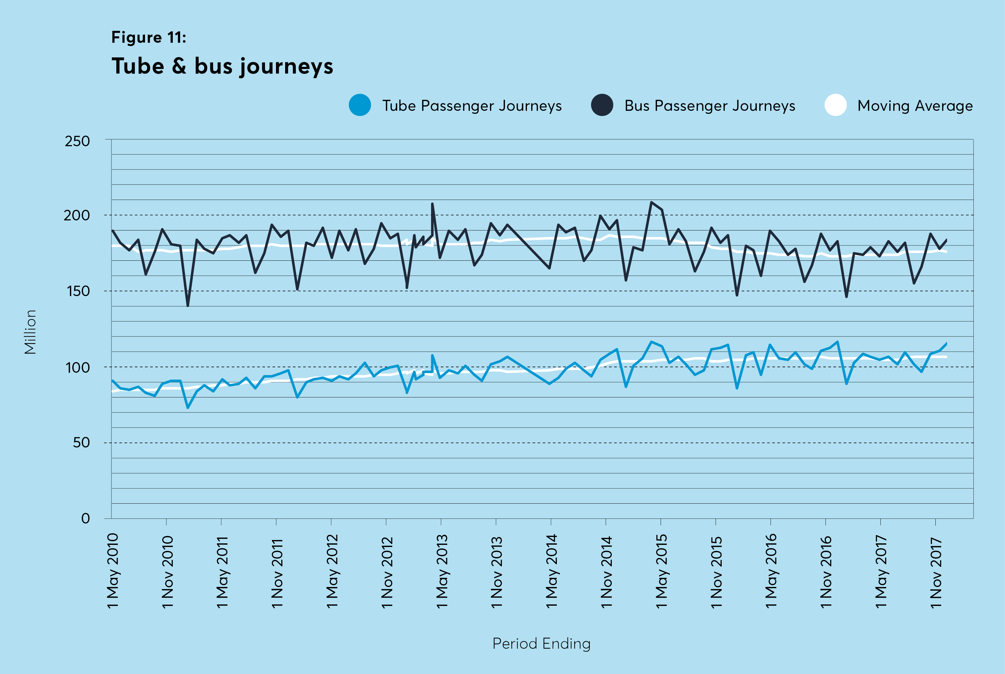 The last three periods (of four weeks each) have seen declining year-on-year numbers of tube journeys – between 1.3 and 1.8 per cent drops. Possible reasons identified for this fall– in a period of economic expansion and population growth, and despite a fare freeze – include the knock-on impact of the Southern Rail dispute, heightened concern about security, an increase in use of private hire services such as Uber, changing work patterns, and changing consumption habits.