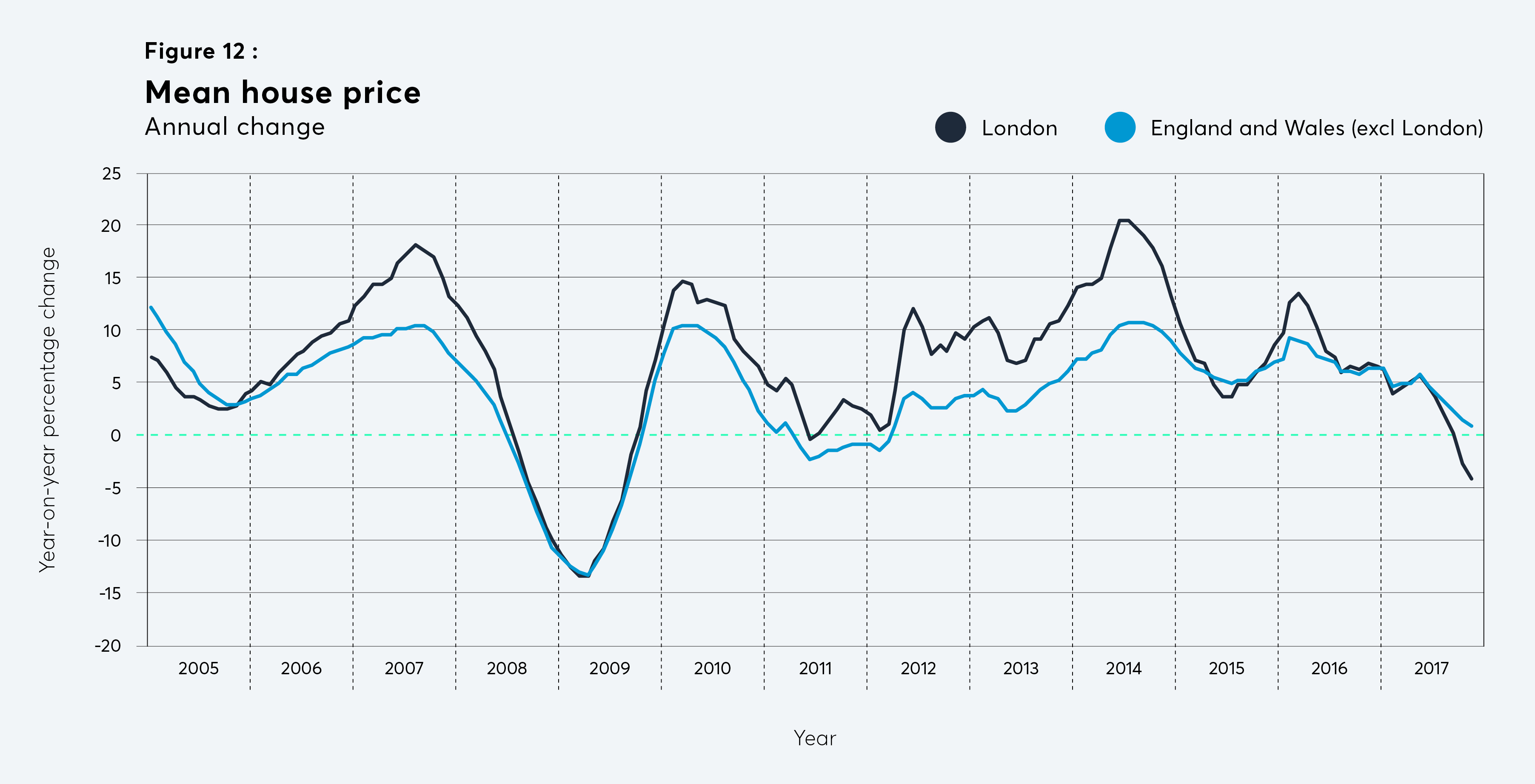 London’s house prices fell by 4.1 per cent in the year to November 2017, the largest fall since August 2009, according to Acadata figures used by The London Intelligence. The rest of England and Wales is also experiencing a slowdown, although not to the same extent – prices rose by a modest 0.9 per cent over the year to November.