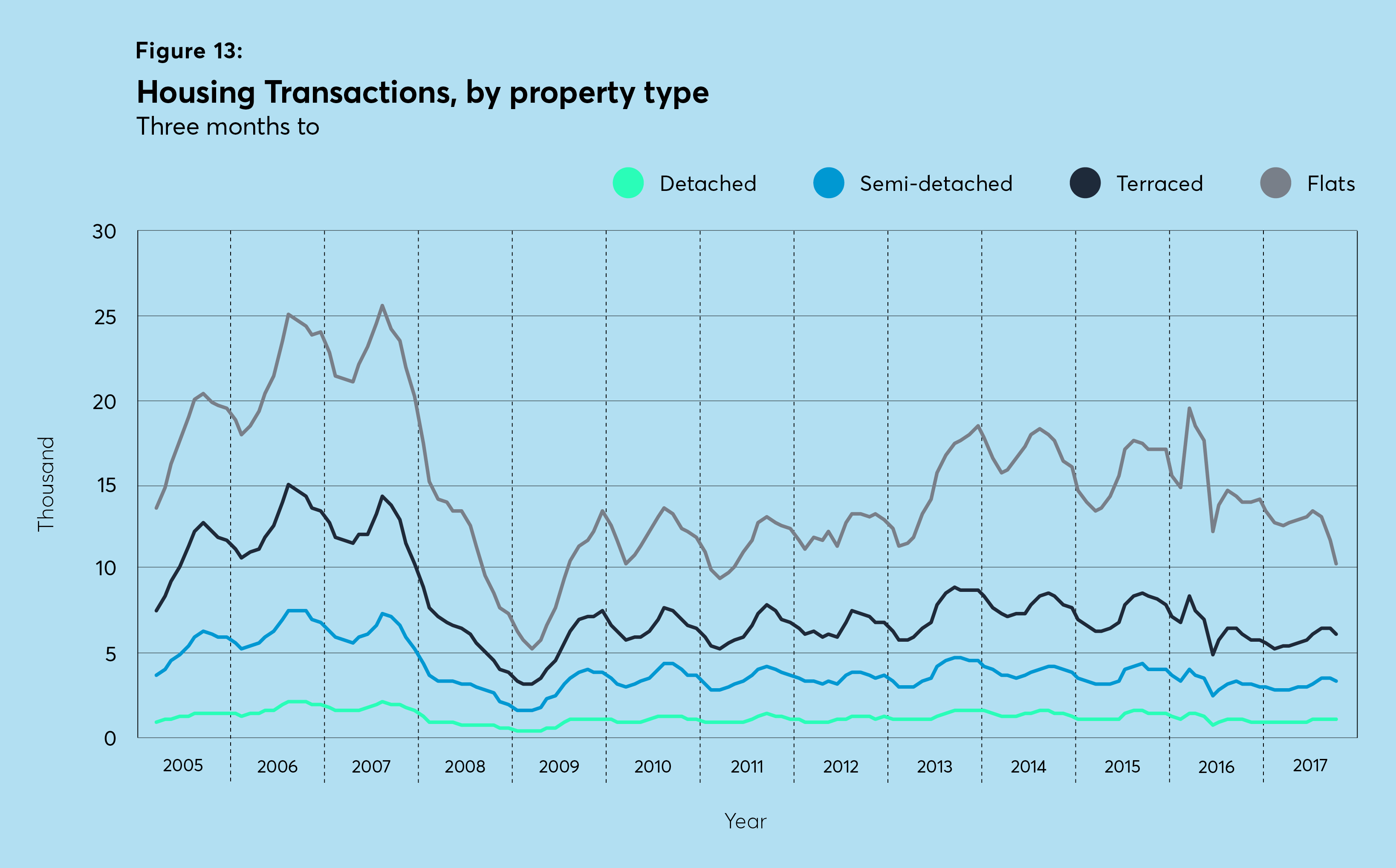 As noted in the last issue, transactions in the capital have been relatively subdued since 2009. Looking at property types, flats account for the largest number of transactions in the capital, but have experienced the largest proportional drop in sales: transactions were down over 25 per cent for the three months to October 2017 (compared to 2016).