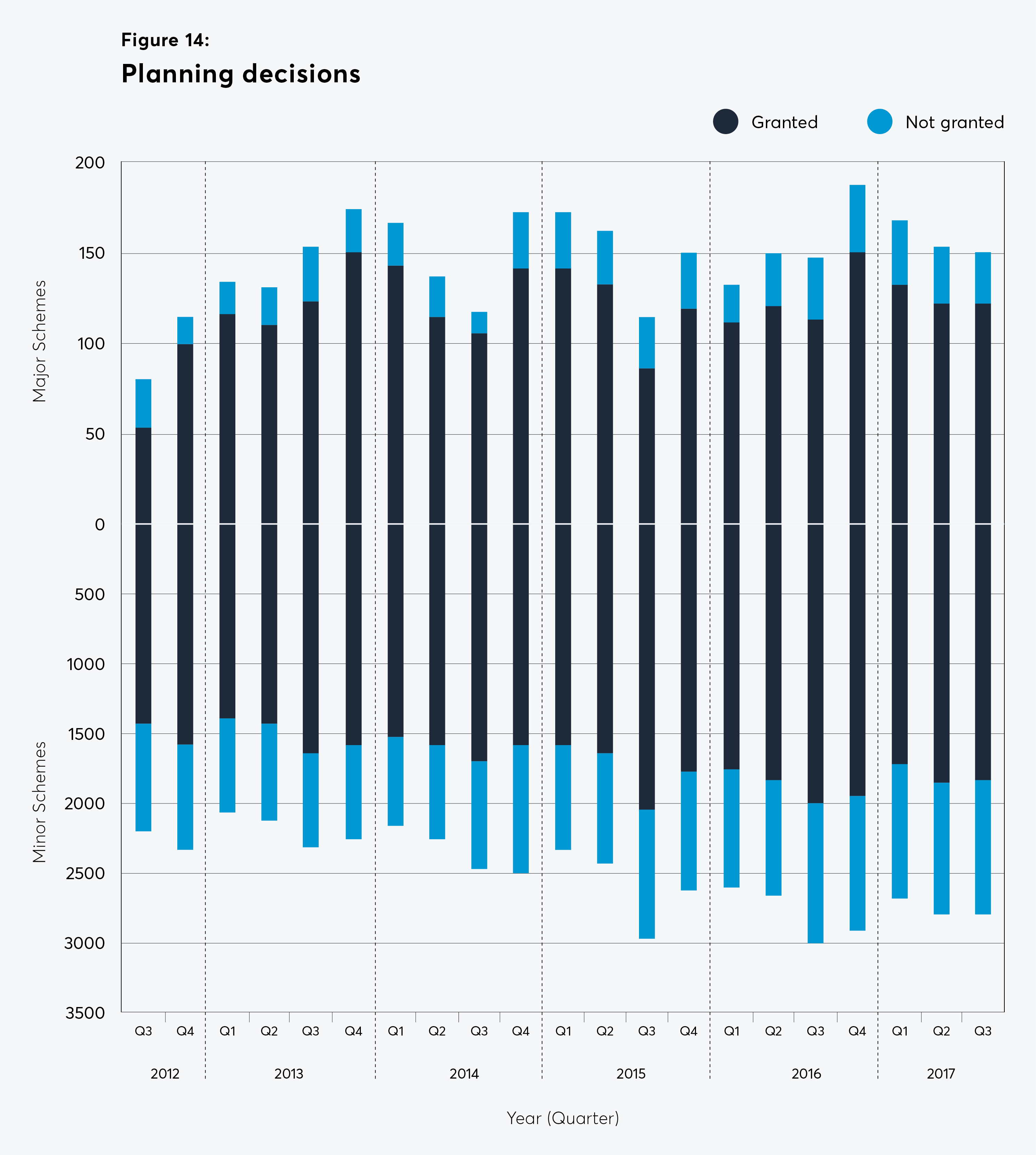 Only two thirds of decisions received permission in Q3 2017 (a figure which has been falling recently), perhaps indicating growing community concerns about affordable housing levels and local impact of schemes.