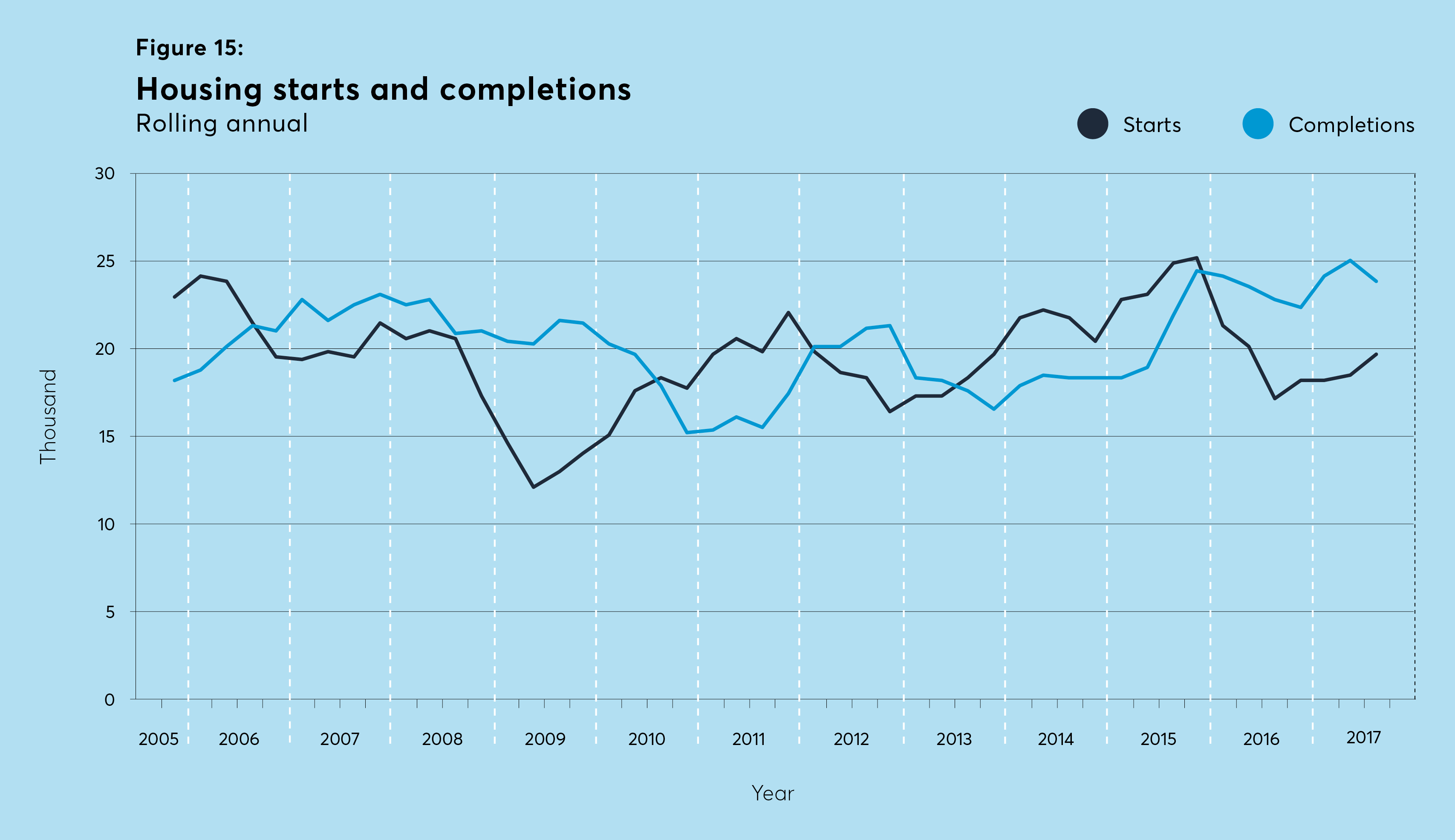 For the year to September 2017, new housing starts picked up a little compared to the year before, to nearly 20,000 units, while completions also rose to nearly 24,000 over the same time period. However sales, particularly of one bed flats, have slowed and prices dropped. It remains to be seen the impact this slowdown will have on starts in future periods.