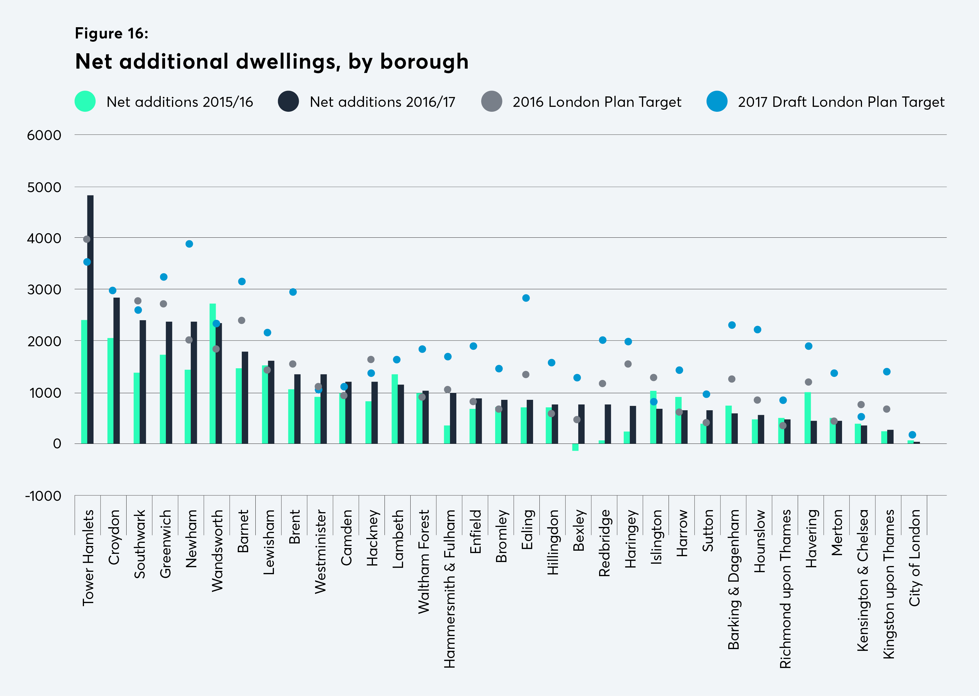 New builds are only one element of meeting London’s housing needs, and net additional dwelling figures for the full year 2016/17 paint a fuller picture. At the city level, net additional dwellings were nearly 40,000 in the latest data – a significant improvement on the previous year, and only just shy of the 2016 London Plan’s target of 42,000. This was helped by a significant proportion which came from change in use – nearly 9,000, or 22 per cent – a much higher proportion than in previous years. This could reflect the growth in ‘permitted development’ of commercial buildings, a form of supply that is highly controversial among London boroughs, as it does not include affordable housing or other planning obligations, and results in loss of commercial space in many town centres.