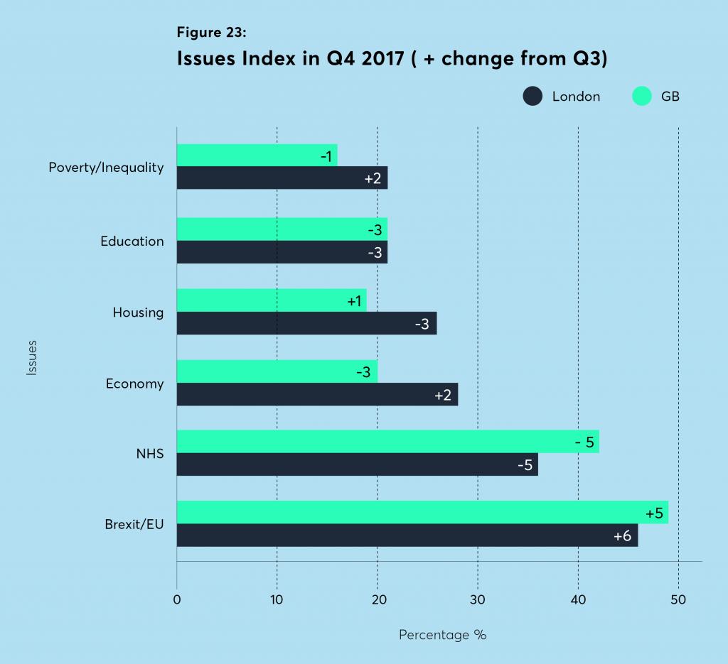 Londoners’ concern about Brexit regains top spot in the Ipsos MORI Issues Index, overtaking the NHS. With London hospitals seemingly doing better than their national counterparts (see later in the issue), it is perhaps unsurprising there is a 6 point different between London and GB on this issue, though the poll was undertaken across the quarter (see appendix), before the current winter crisis took hold. Immigration, meanwhile, falls out of top six spontaneously-mentioned topics, and has been replaced by poverty/inequality, perhaps a reflection of the shifting political narrative in the capital and country.