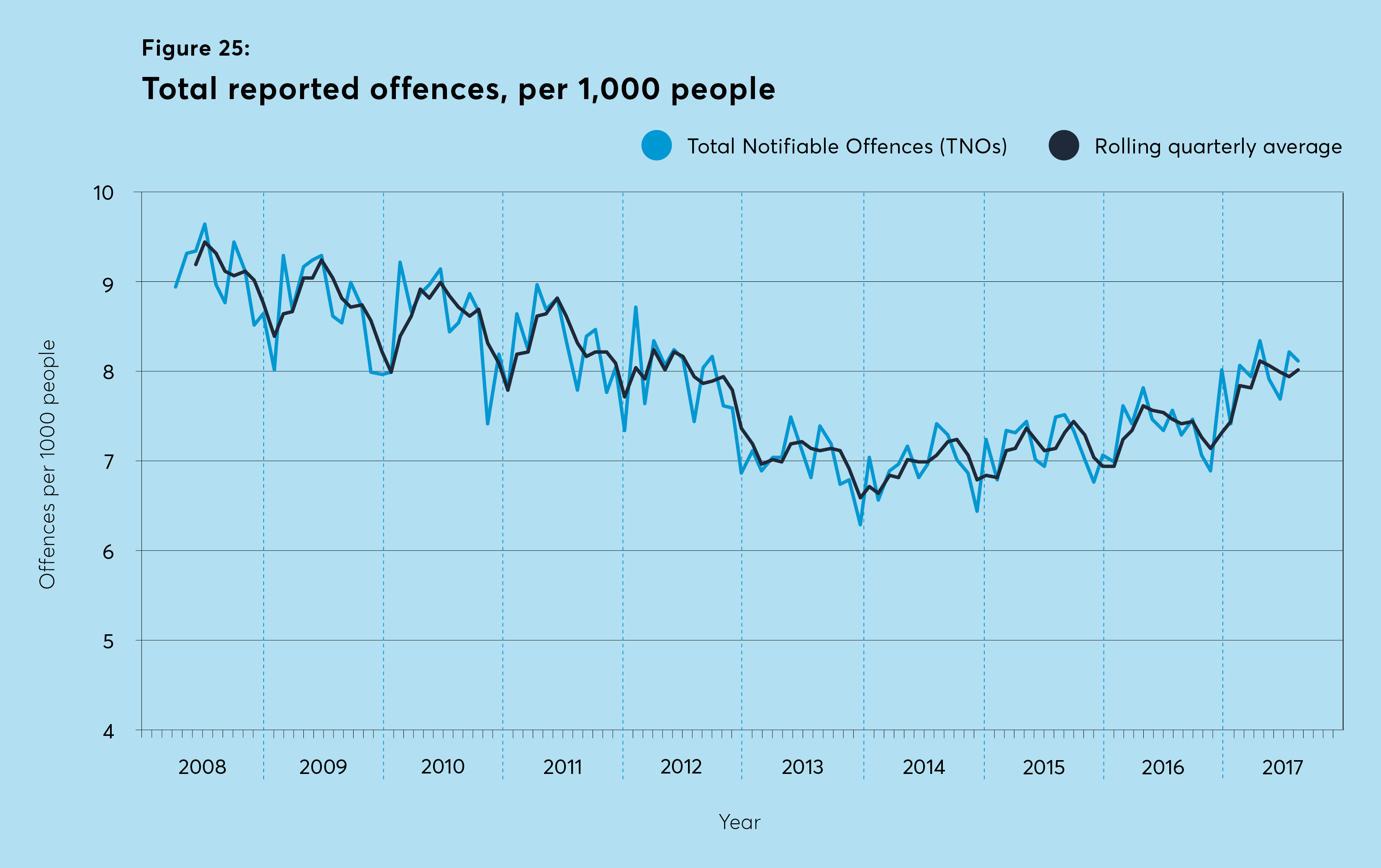 Total Notifiable Offences (TNOs) were at over 71,000 in November, a 13 per cent rise compared to the same month in 2016. For the quarter to November, reported offences were up 10 per cent on last year’s figures, and year-on-year rises have been at record highs for the last seven months.