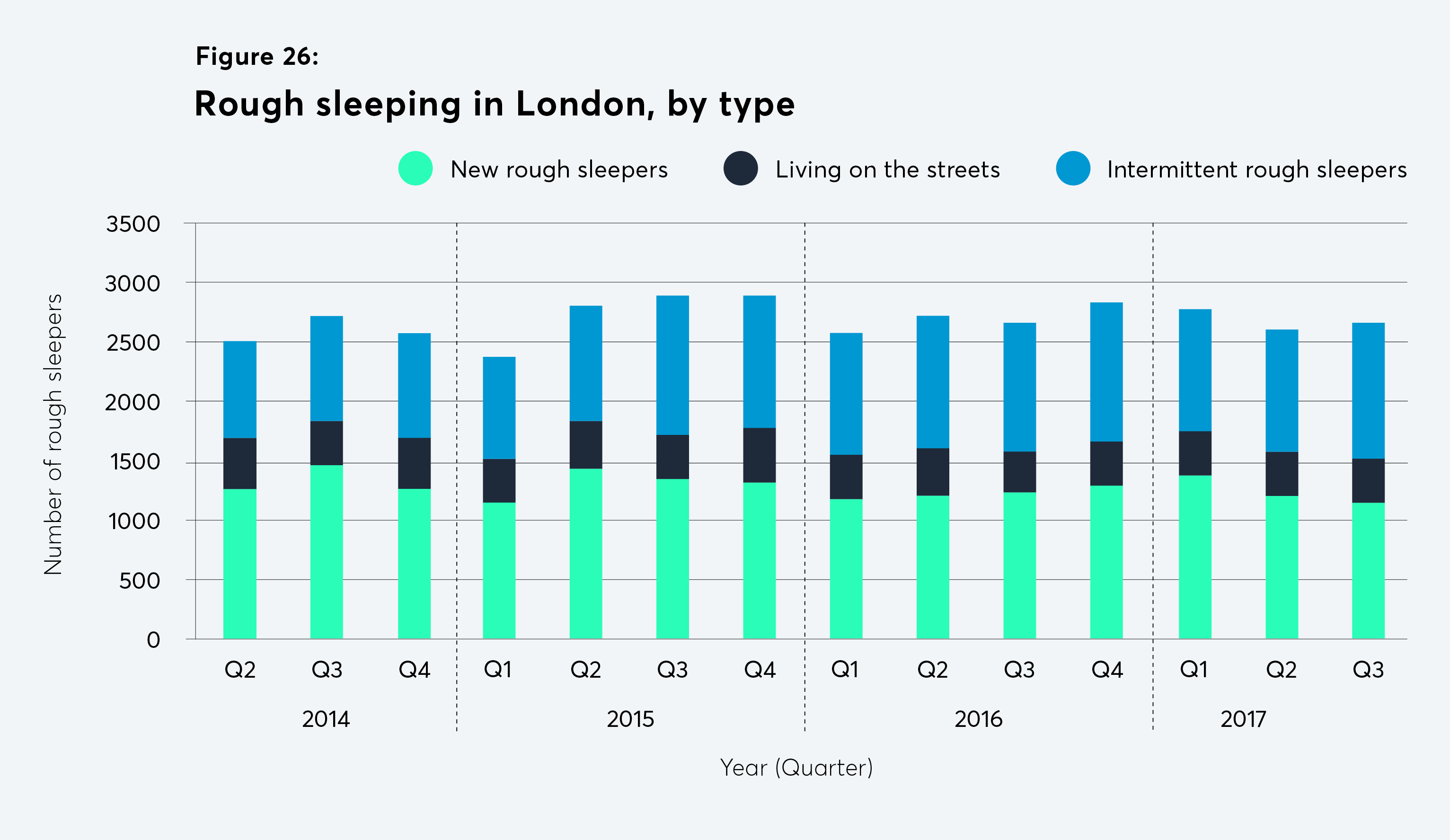 The total number of rough sleepers in the capital rose slightly in the third quarter of last year, to nearly 2,700. The data suggests that nearly 400 of these people live on the streets, with their numbers concentrated in central London. In addition nearly 4,500 households in the capital fitted the statutory definition of homelessness that calls for local authority support (at a rate more than double the rest of the UK).