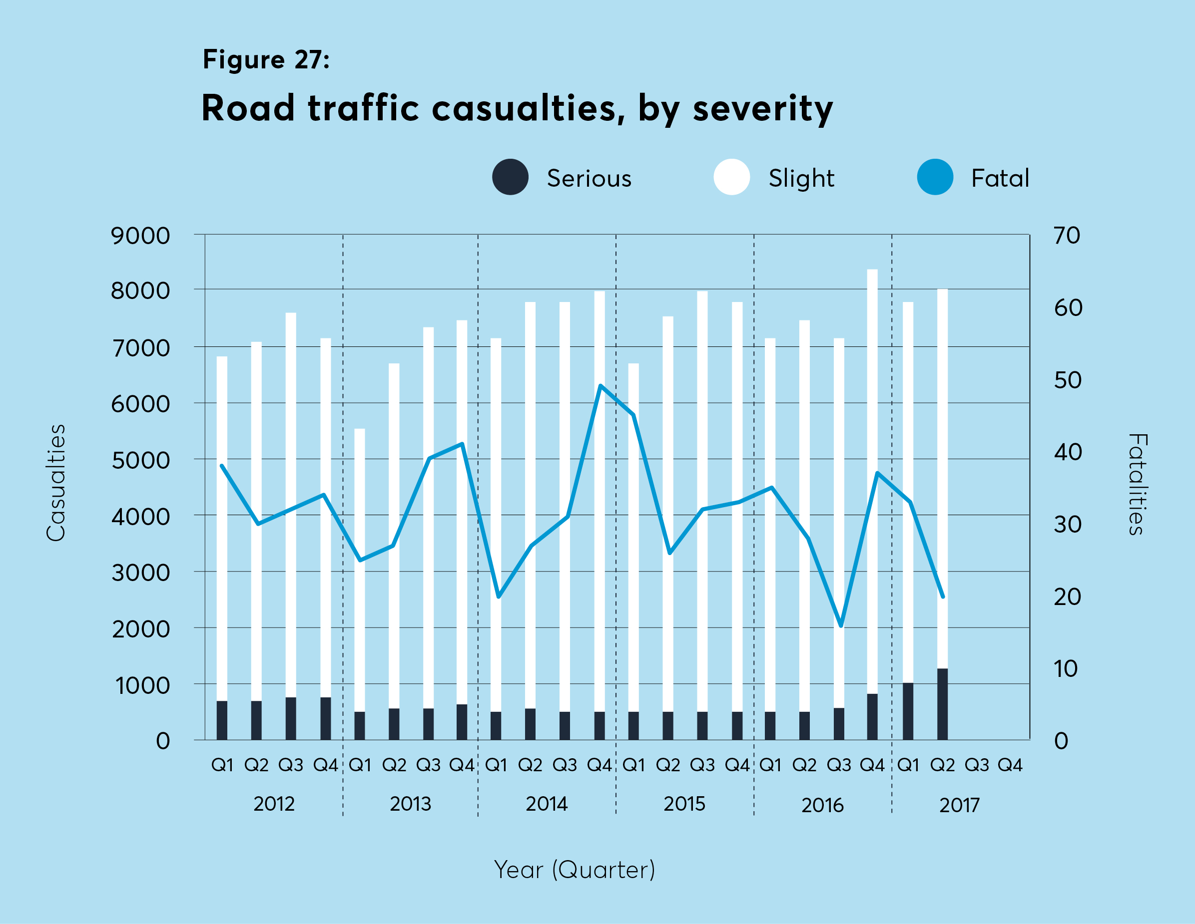 Total reported incidents on London’s roads which resulted in a casualty stood at over 8,000 in the second quarter of 2017. There were 20 fatalities, which is the second lowest quarterly figure in the last five years.