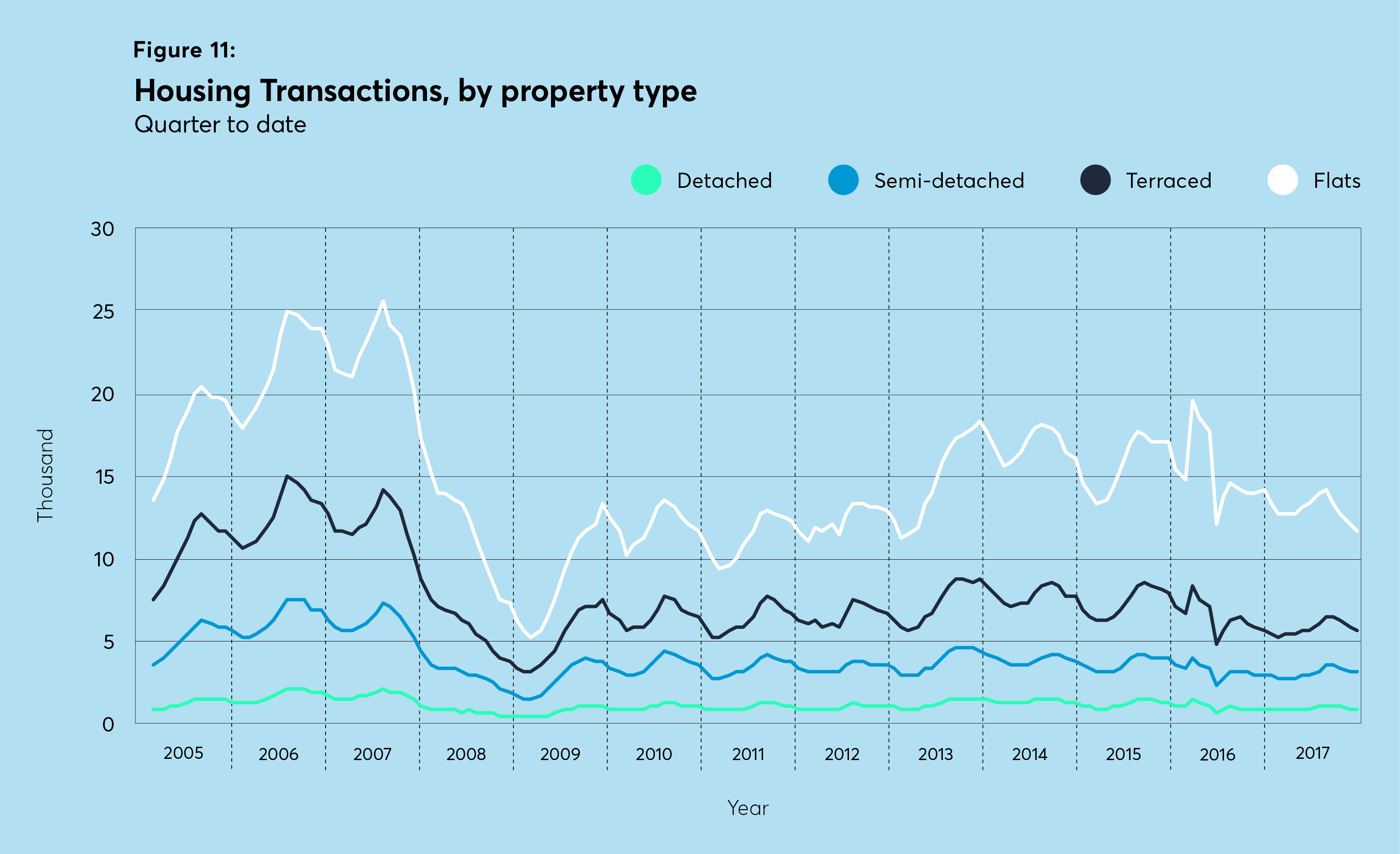 The cooling of the market is reflected in the transaction data as well – data from the end of 2017 indicates transactions from October-December were 10 per cent lower than the previous year. Flats, while still the largest by volume, exhibit the sharpest slowdown in transactions, falling 17.5 per cent, while semi-detached homes saw transactions actually increase by 3.2 per cent. Over the course of the year, however, the rate at which flats and semi-detached houses were transacted (both 2.8 per cent of stock) was marginally below detached homes (3.2 per cent) but above terraced homes (2.6 per cent).