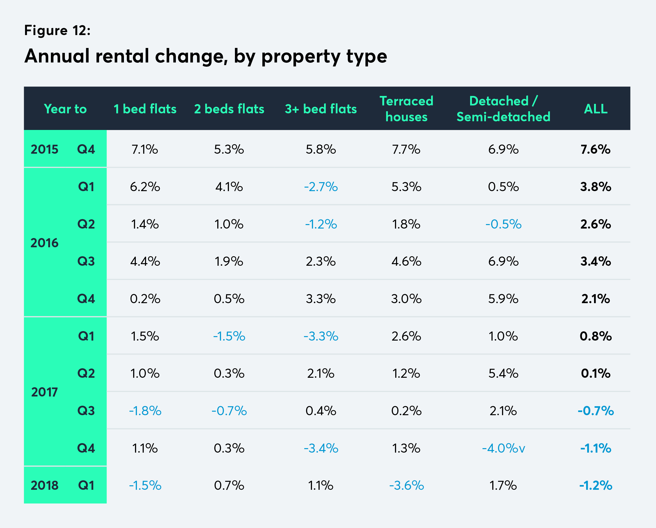 Average rents paid continue to fall – compared to the same period last year, Q1 rents were 1.2 per cent lower, which was the third consecutive quarter of declines. Smaller flats saw small increase or decreases, while terraced houses saw the largest year-on-year fall (-3.6 per cent). Detached and semi-detached rental properties saw the largest growth, after a significant fall last quarter, likely due to a slight market correction.