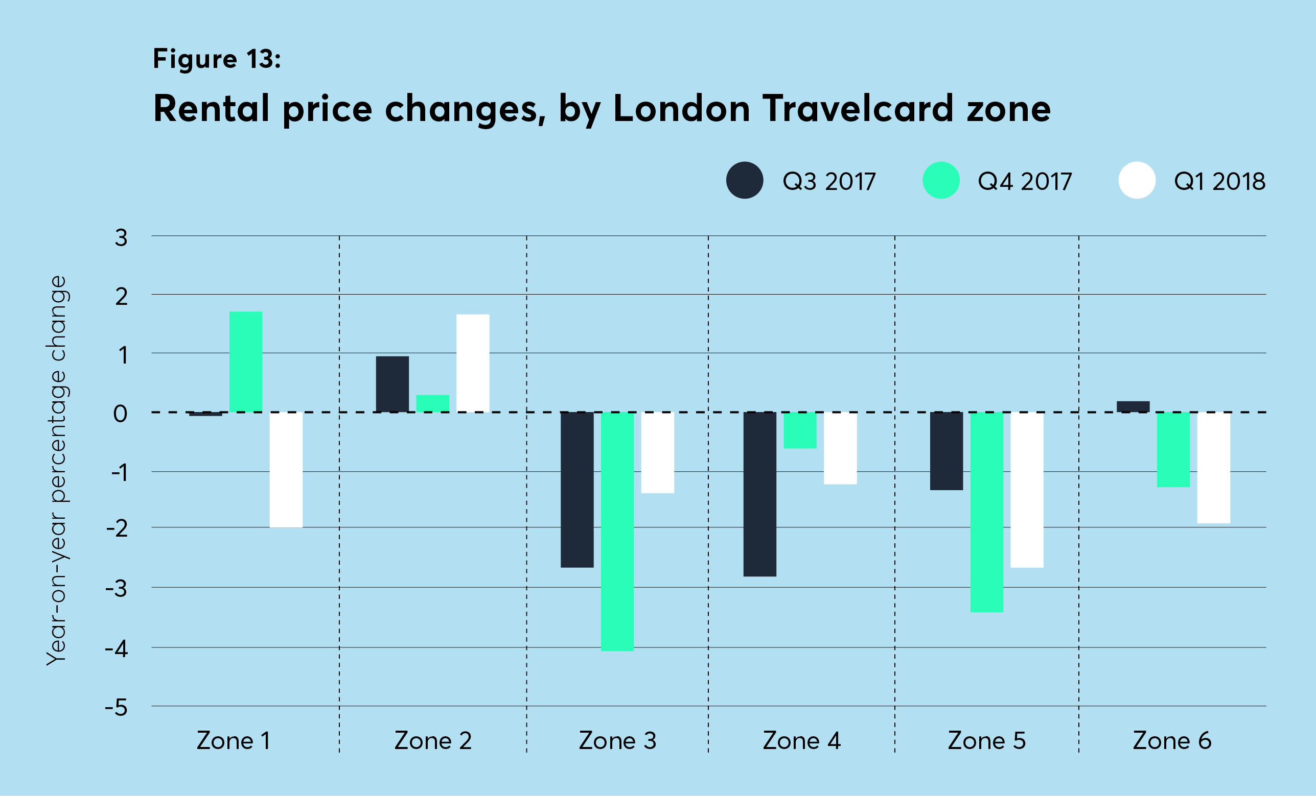 Zones 3 and 5, which saw the deepest drops at the end of last year, have recovered a little, but still fell 1.4 and 2.7 per cent respectively. Zone 1, on the other hand, fell 2 per cent, as the prime central London market adapts to a slight oversupply recently.