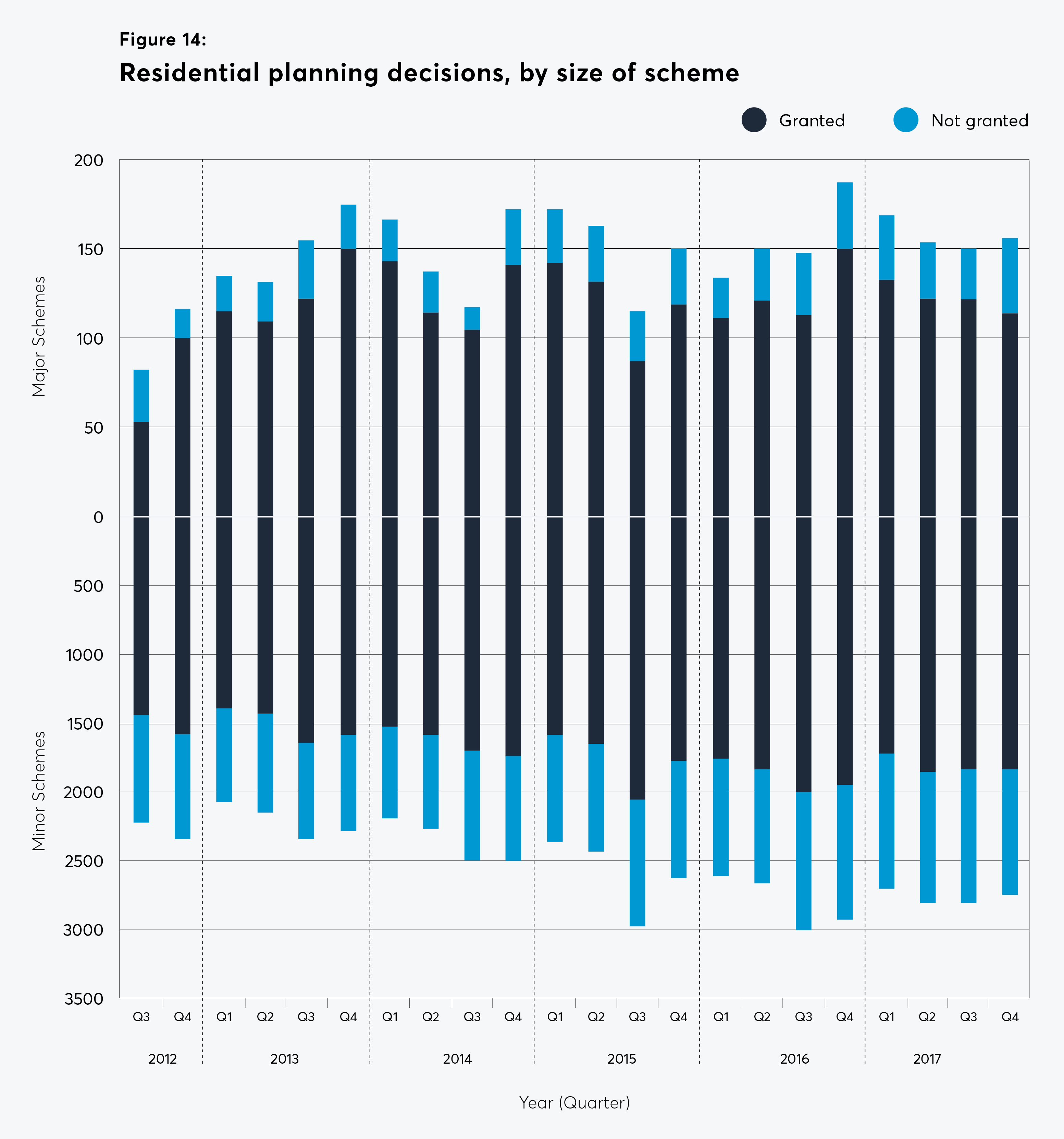 The number of total minor schemes decided on and those granted permission, also fell, although the proportion rejected was in line with the longer-term trend, at just under one third (although some may be duplicates of approved schemes).