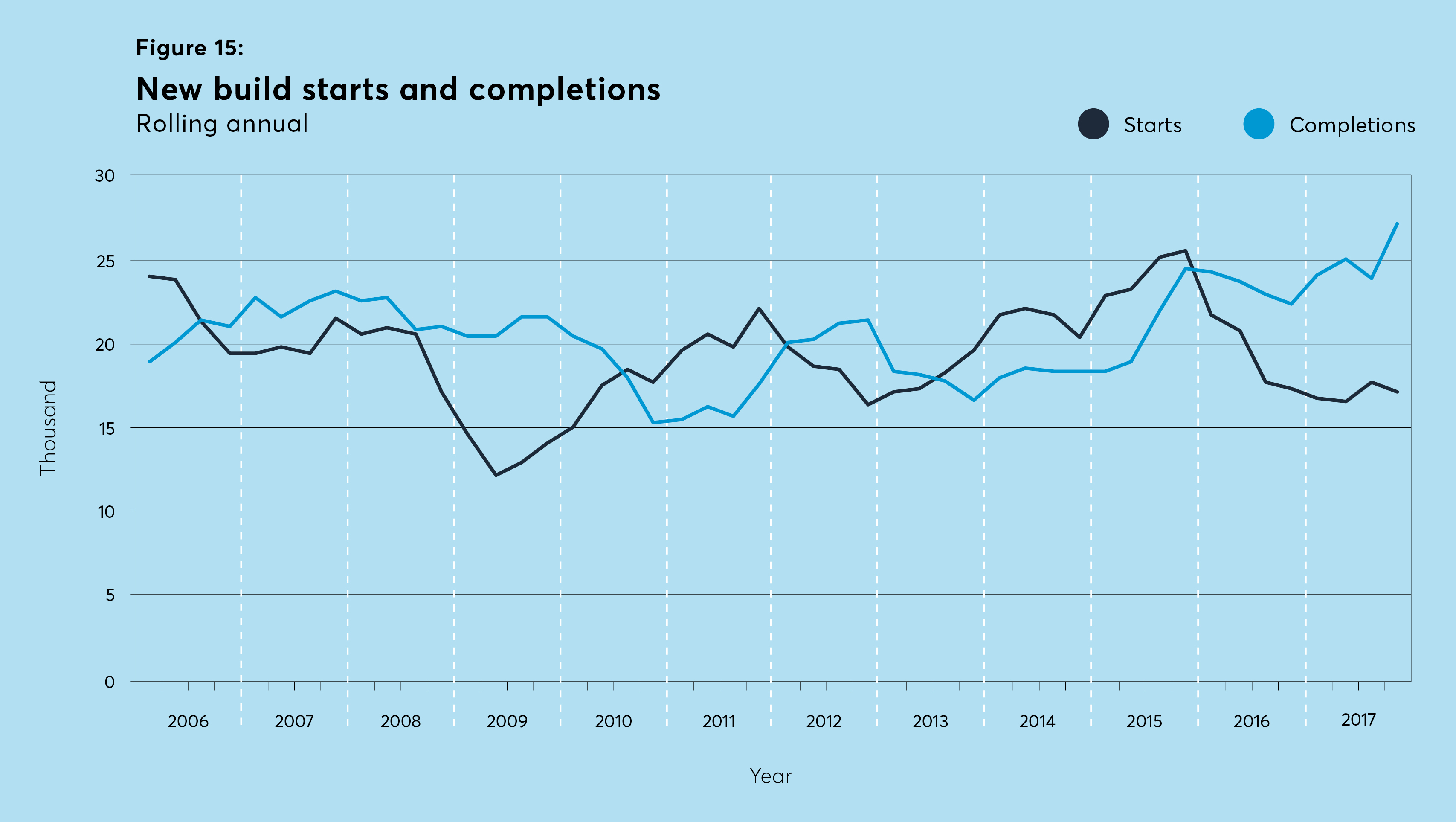For the full-year 2017, new housing starts were marginally under the equivalent figure for 2016, at 17,220. Completions rose to a record high of over 27,000, a result of a number of high profile schemes coming to market, although there remain concerns over the levels of affordable housing in some schemes.