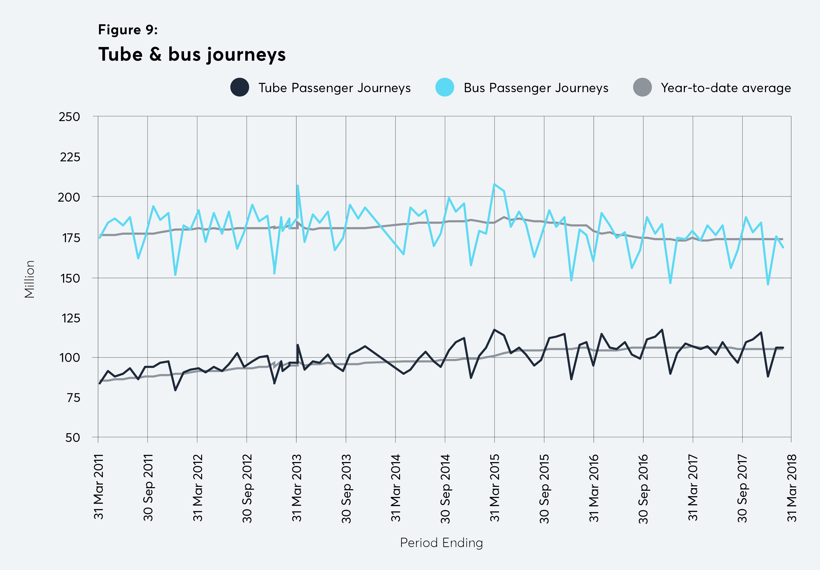 Ridership figures show the significant negative impact the cold weather – particularly the so-called ‘Beast from the East’ – in the early part of the year had on London’s public transport performance. In the period ending the 3rd March, Tube journeys were down 2.8 per cent compared to the year before, while bus journeys fell 1.1 per cent. These significant drops came off the back of a more upbeat looking February, where tube riders rose 3.5 per cent – the first increase in almost a year – while bus use rose just 0.1 per cent – continuing its recent, if muted, resurgence.