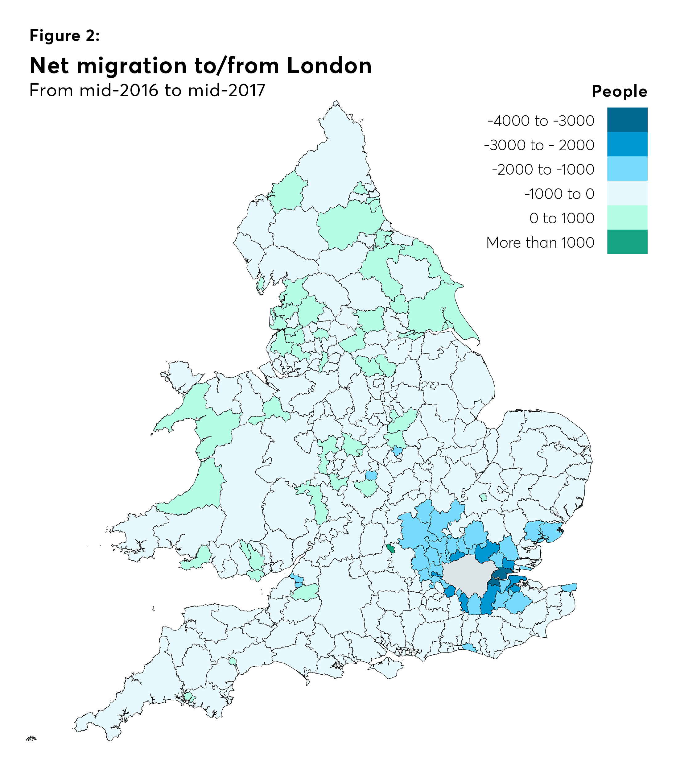 The contribution of net international migration has declined considerably year-on-year to a net gain of just under 83,000 individuals. Though international migration remains the largest contributor to population growth, it now only contributes 5,000 more individuals than those added through natural change (births and deaths). Net internal migration saw a balance of 107,000 people leave London for the rest of the UK, more than 14 per cent higher than the year previously.