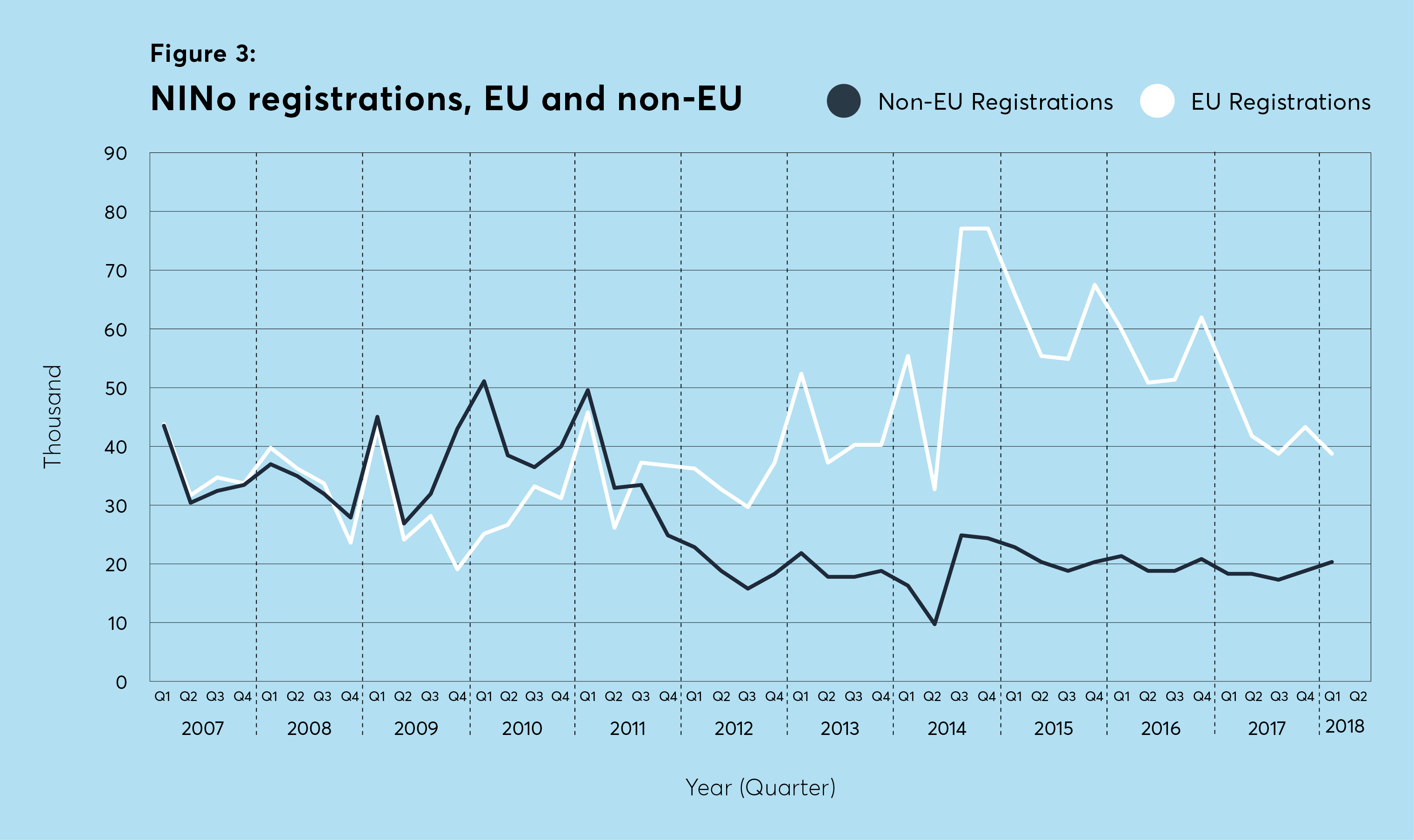 EU registrations continue to fall – 25 per cent year-on-year – while non-EU registrations grew by 9 per cent, after four consecutive quarters of falls.