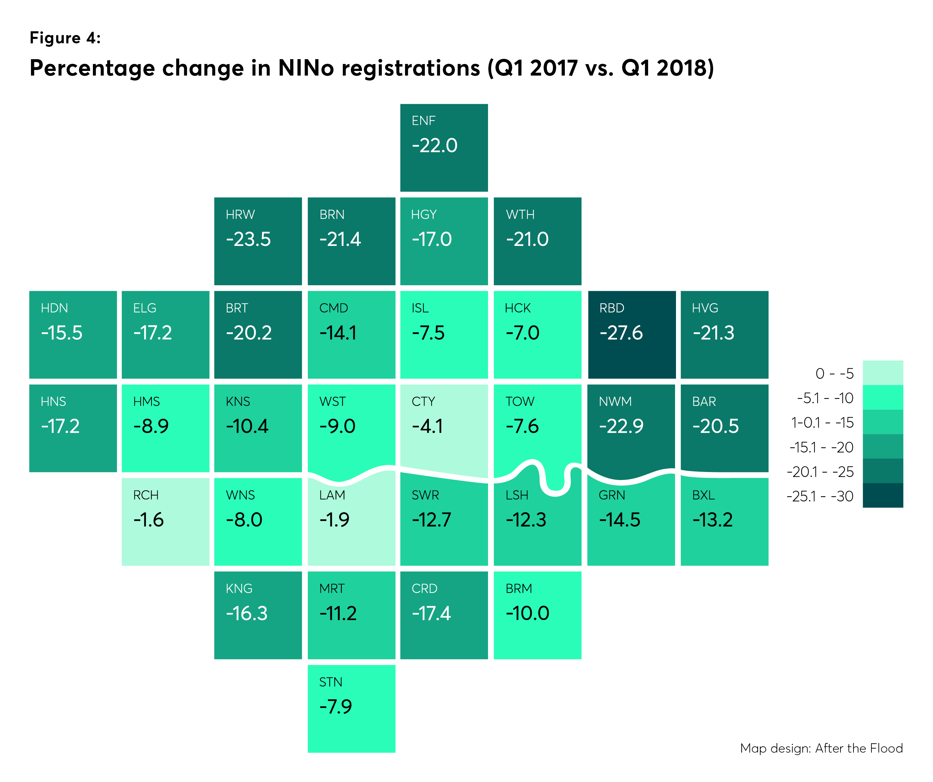 A number of boroughs, particularly in the east, north and north west of the city, show much sharper declines in registrations than the London average. Redbridge saw the largest fall, of nearly 30 per cent, closely followed by Harrow (-23.5 per cent) and Newham (-22.9 per cent) – the latter accommodates the highest proportion of registrations overall.