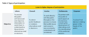 There are a number of frameworks which can help make sense of how community engagement varies. Table 3 is adapted from the International Association for Public Participation’s “Spectrum of Participation”, 1 and is a useful heuristic for understanding the different degrees of influence.
