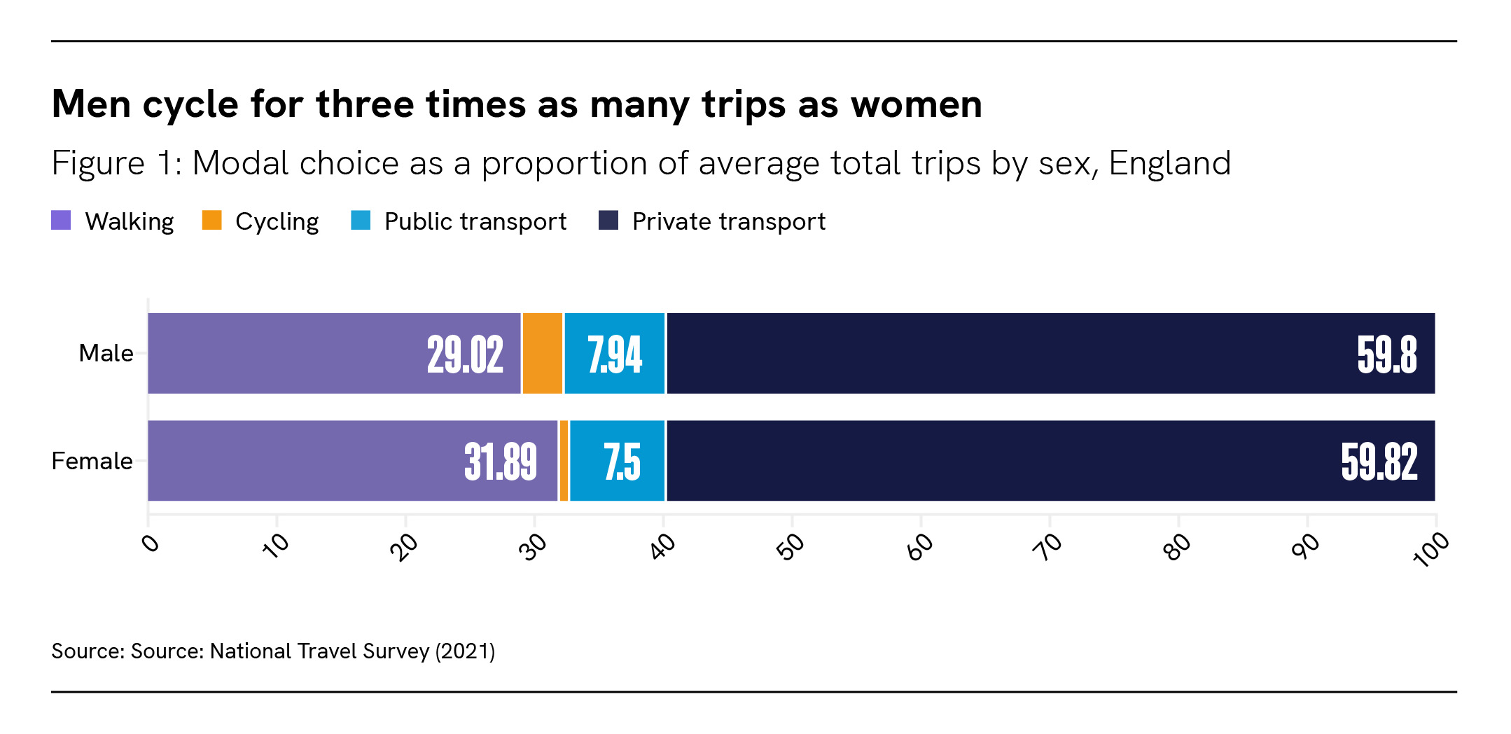 • Women walk for a greater proportion of trips than men, whilst men cycle for more than three times as many trips as women (see Figure 1). The gendered nature of domestic and caring responsibilities often means that women make more frequent and shorter trips. 4 These sorts of short journeys lend themselves to walking, but the additional needs involved in caring whilst on a trip can make cycling an unsuitable transport mode. Research from Sustrans also found that women often do not feel safe when cycling. 5