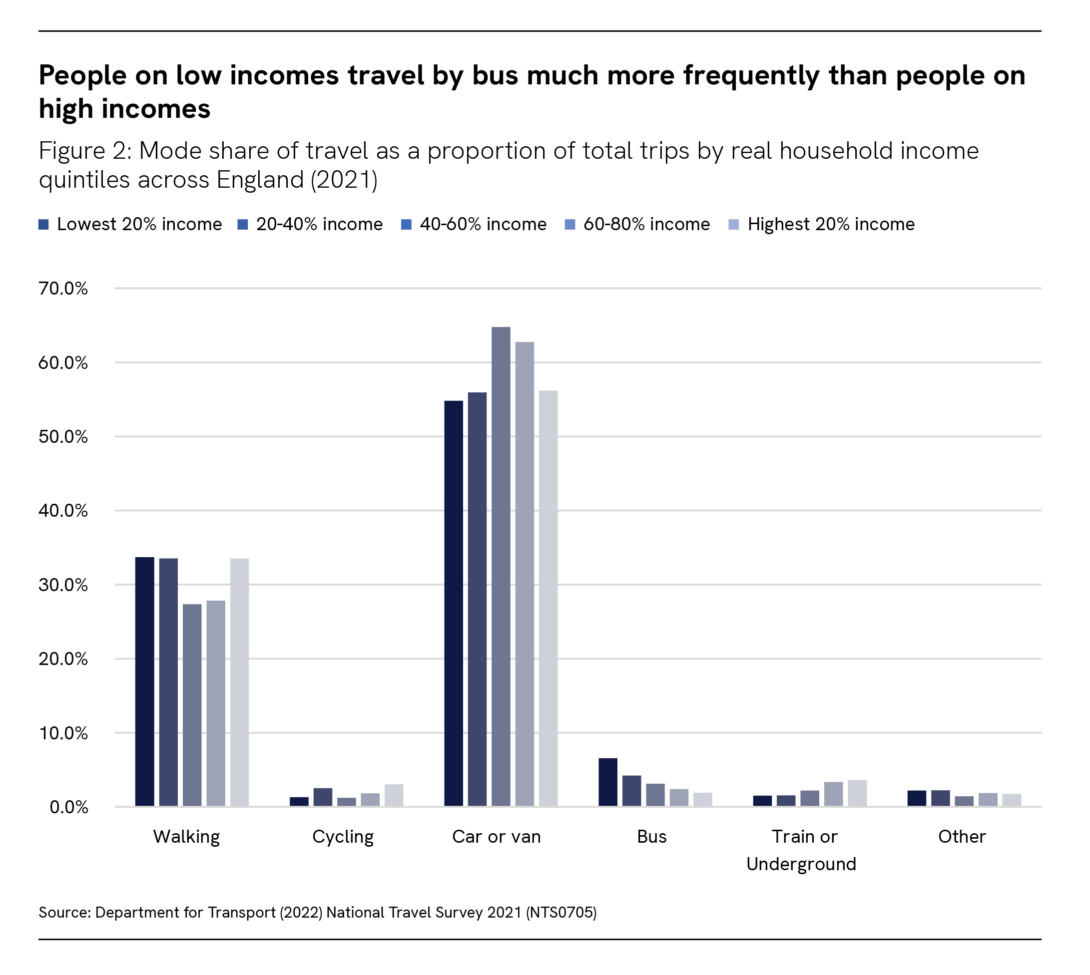 • People in lower-income households travel by bus far more than households on higher incomes; meanwhile, the inverse is true of train travel (see Figure 2). One explanation for this pattern is the relative cost of these transport modes; bus fares are typically much cheaper than train fares.