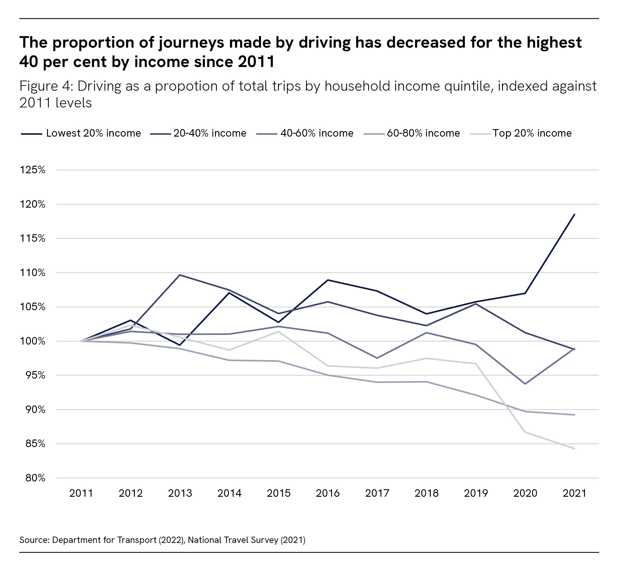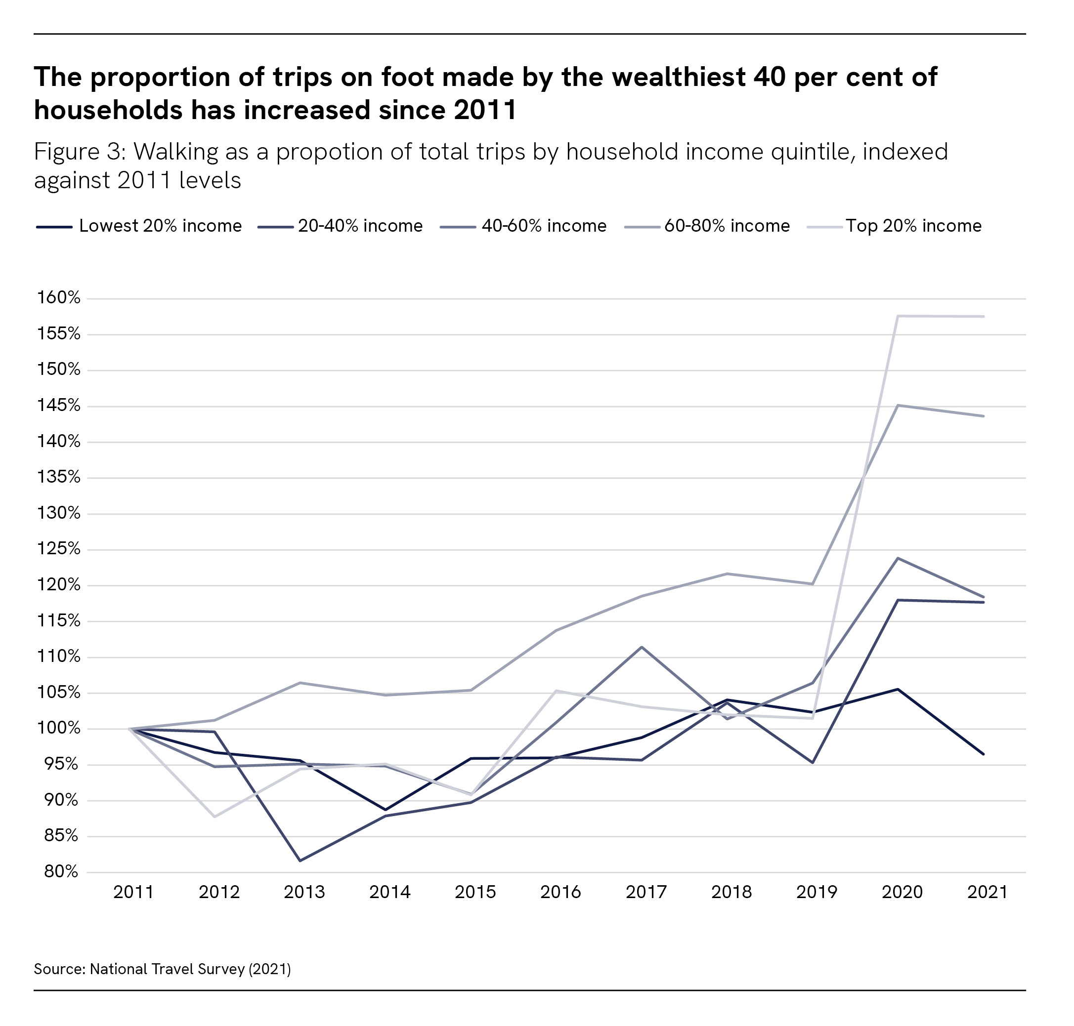 • Between 2011 and 2021, the proportions of trips on foot made by the wealthiest 40 per cent of households has substantially increased while the proportion for the lowest 20 per cent has remained roughly the same (see Figure 3). Similarly, the proportion of trips made by car or van has been steadily decreasing for wealthier groups whilst staying the same or increasing for lower-income households (see Figure 4). Households with the lowest incomes are also likely to drive less than wealthier households but drive shorter distances when they do. 10
