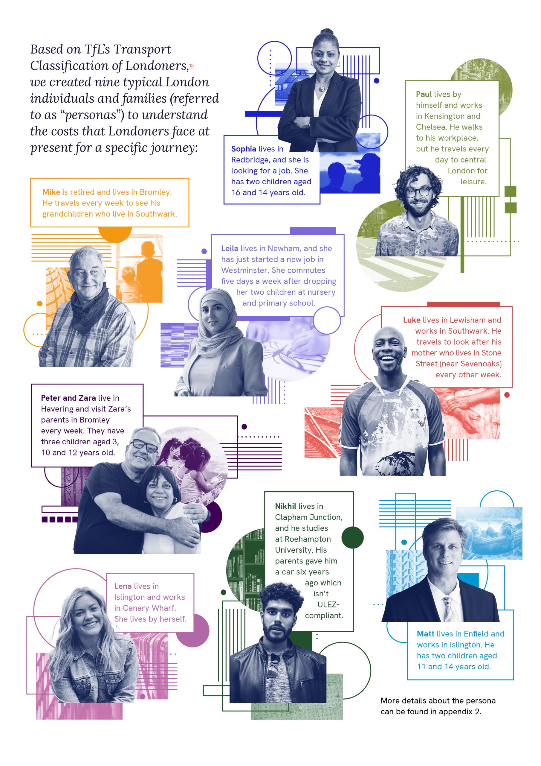 Based on TfL’s Transport Classification of Londoners, 1 we created nine typical London individuals and families (referred to as “personas”) to understand the costs that Londoners face at present for a specific journey: